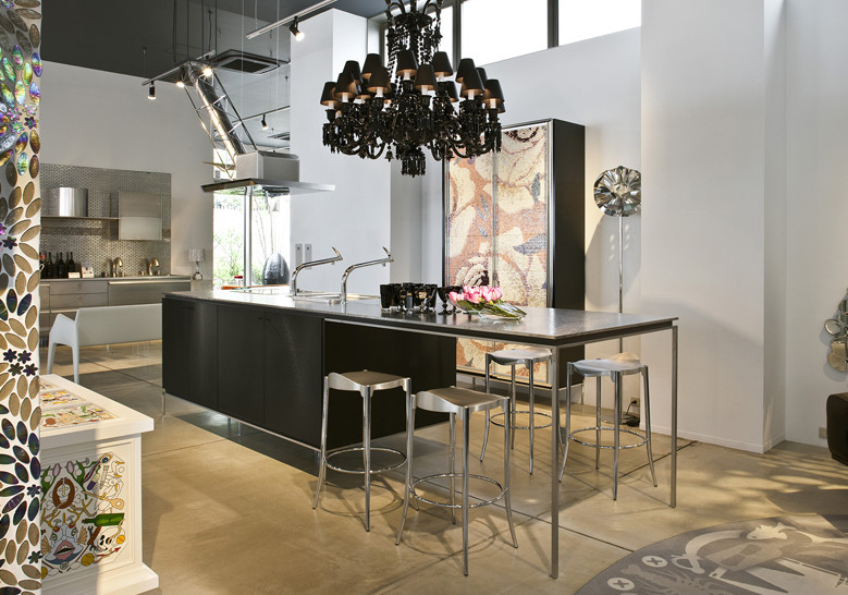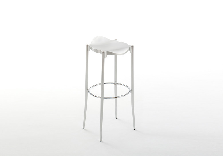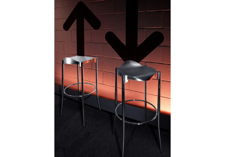 Taburete con estructura de tubo en acero cromado. Asiento en fundición de aluminio AG3 pulido scotch y anodizado