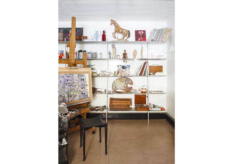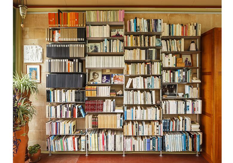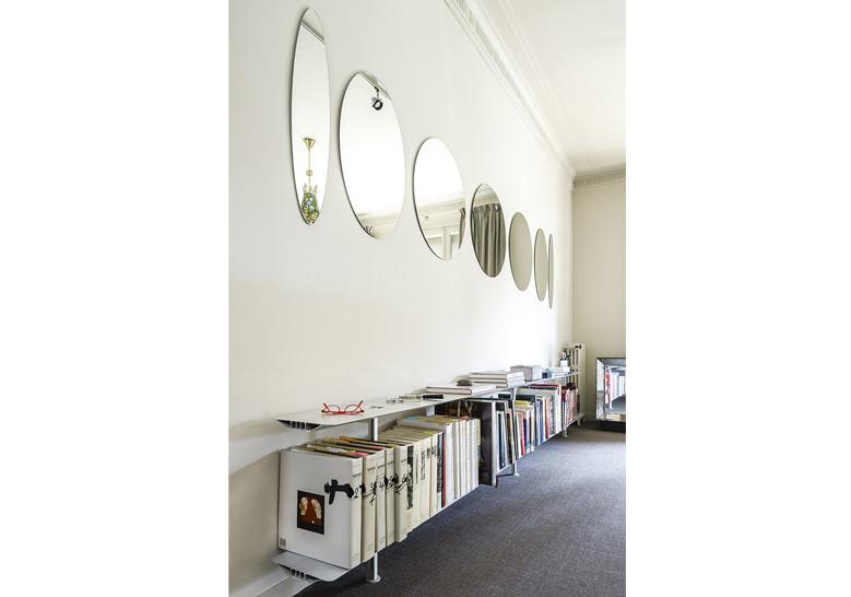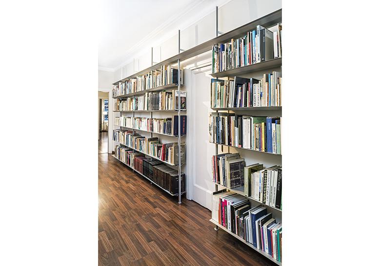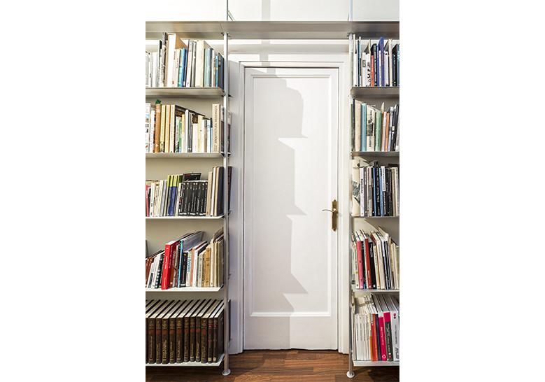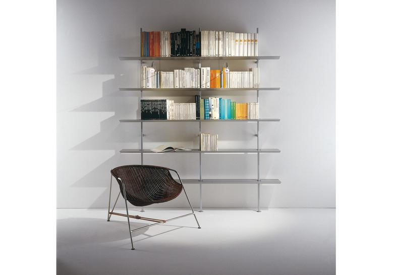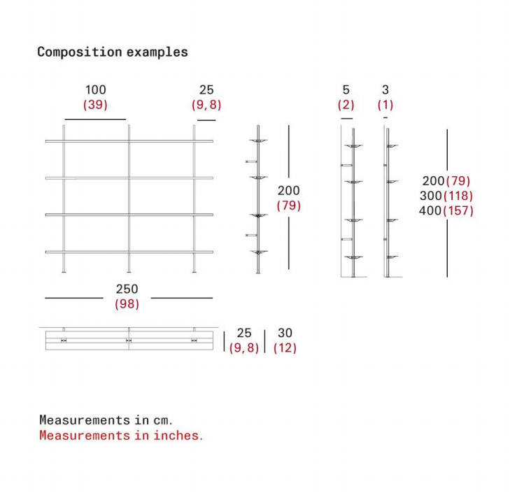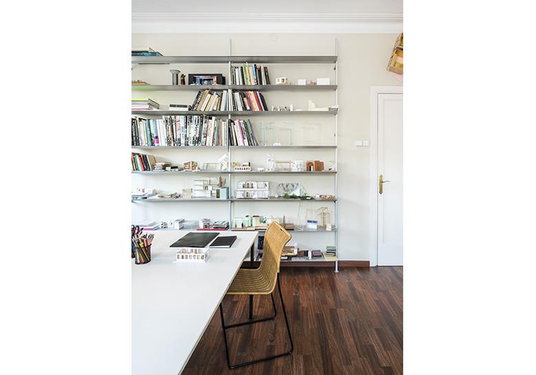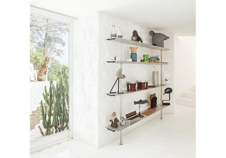 Estantes y soporte vertical en extrusión de aluminio, cepillado y anodizado plata. Herrajes de sujeción en