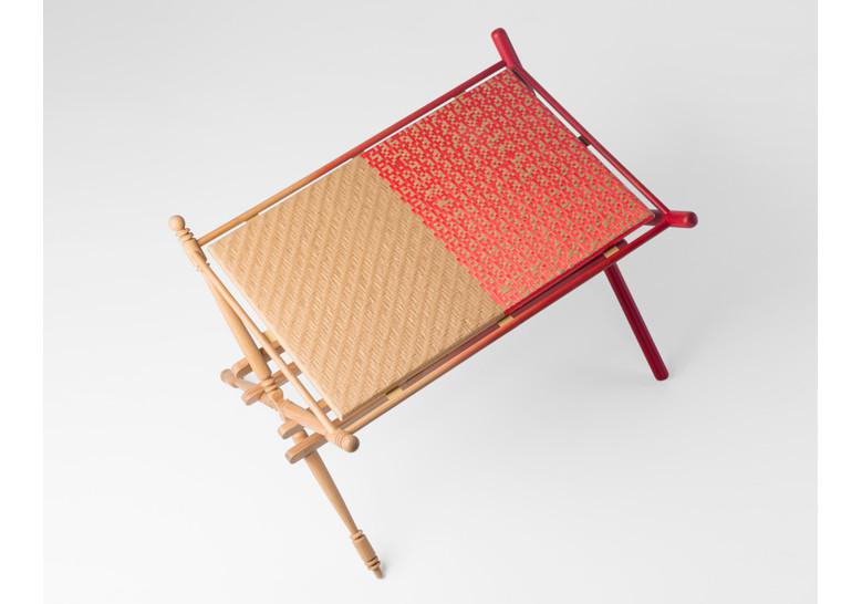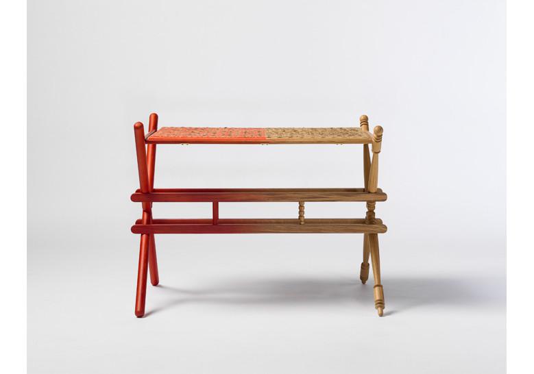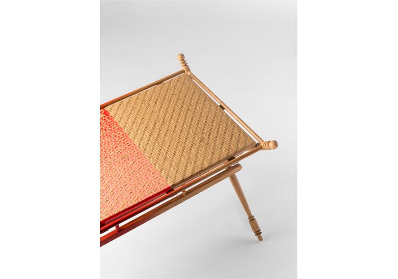 Estructura de roble macizo y bandeja tejida con cinta de papel craft y textil roja.