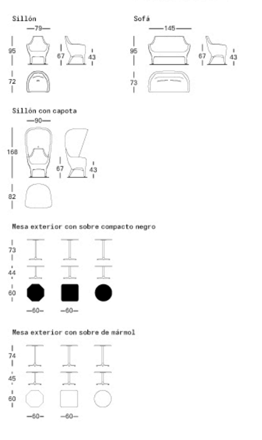 Sillón, sofá y capota fabricadas en una sola pieza en polietileno de media densidad (MDPE) rotomoldeado.