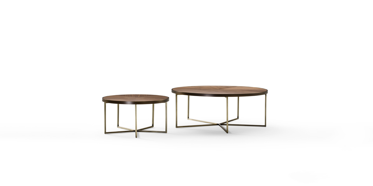 Round tables with structure in metal dark bronze matt finishing. Top in MDF with Canaletto walnut veneer and