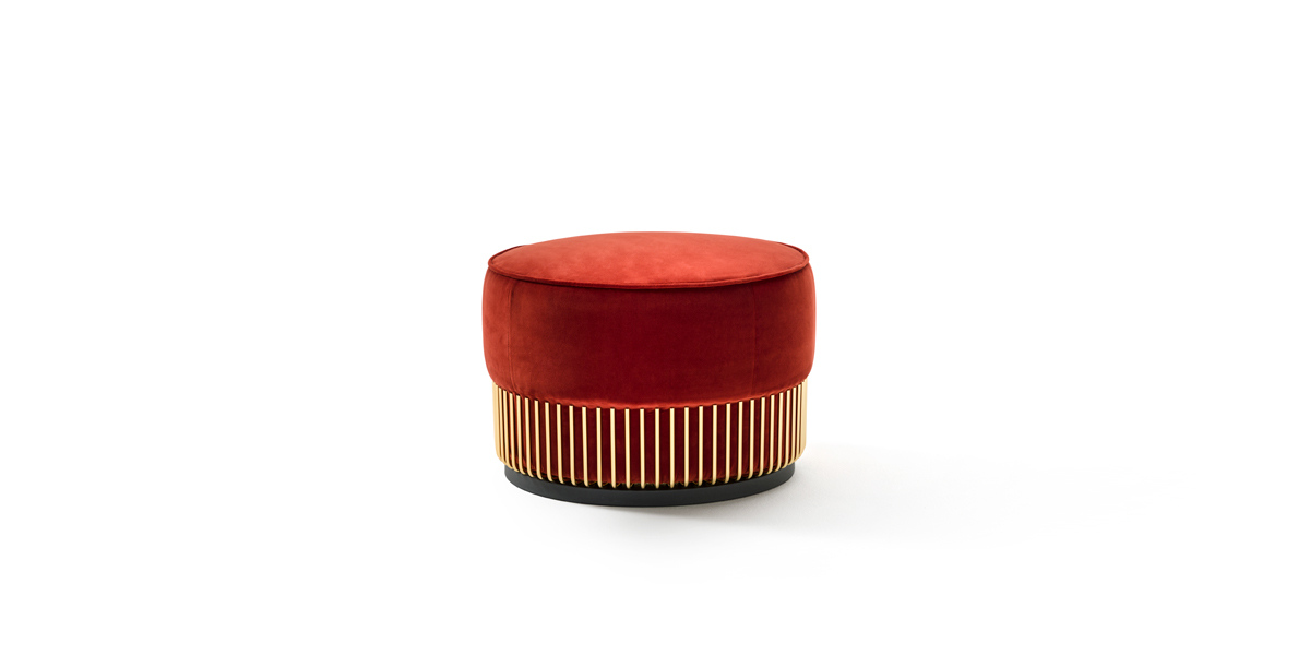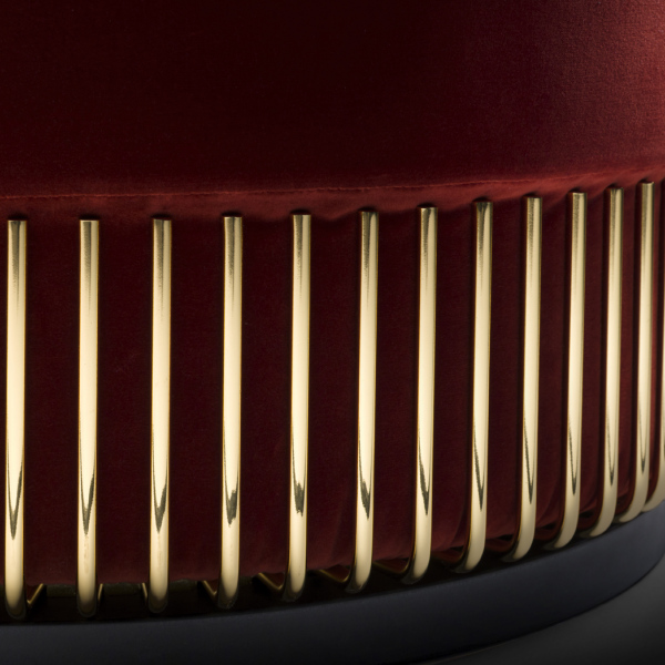 in thermo-bonded fibre with stretch jersey. Metal element in polished gold finishing, base in black laquered MDF.