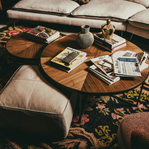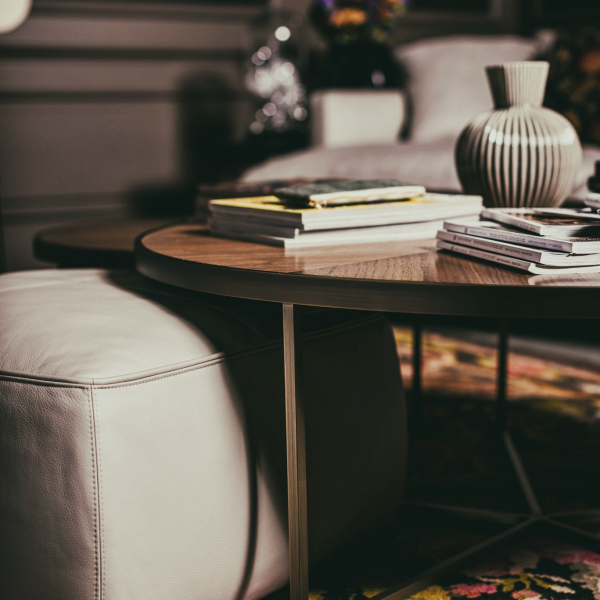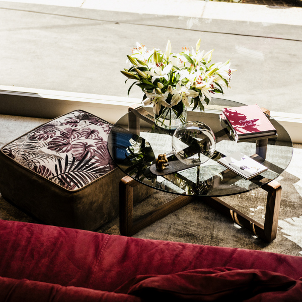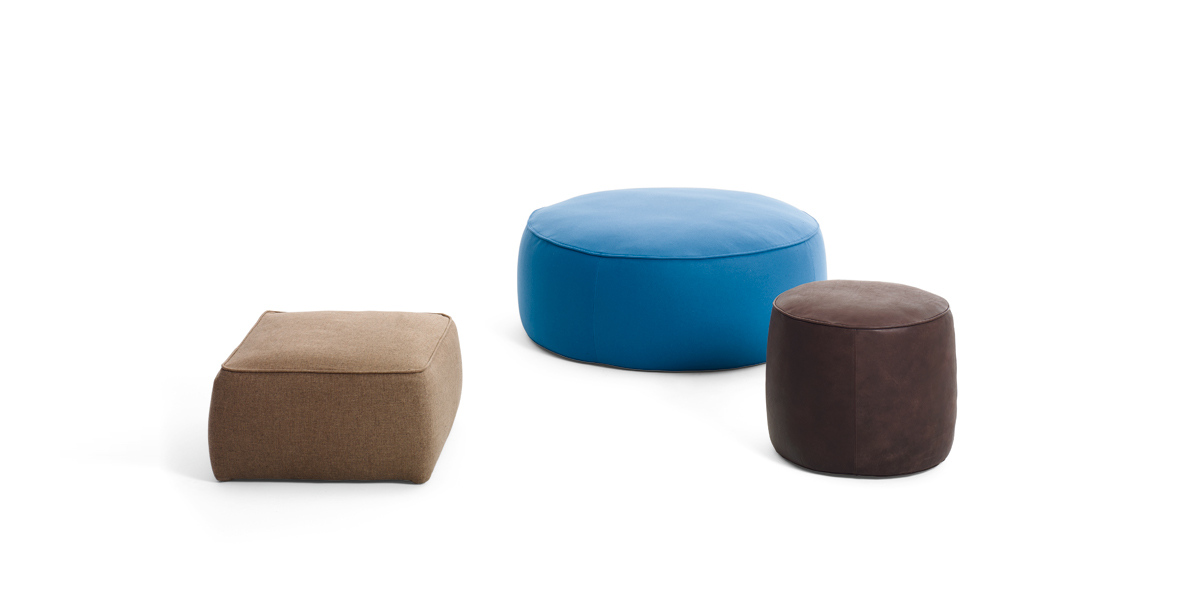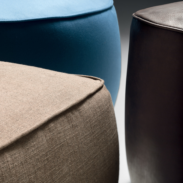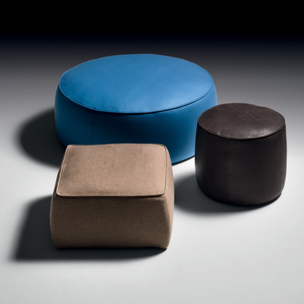 Pouf collection with structure in multi-layered poplar wood. Padding in high-resilience polyurethane foam in different