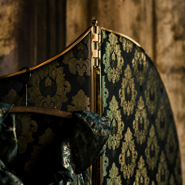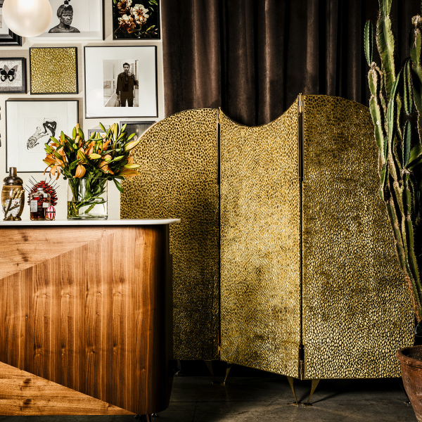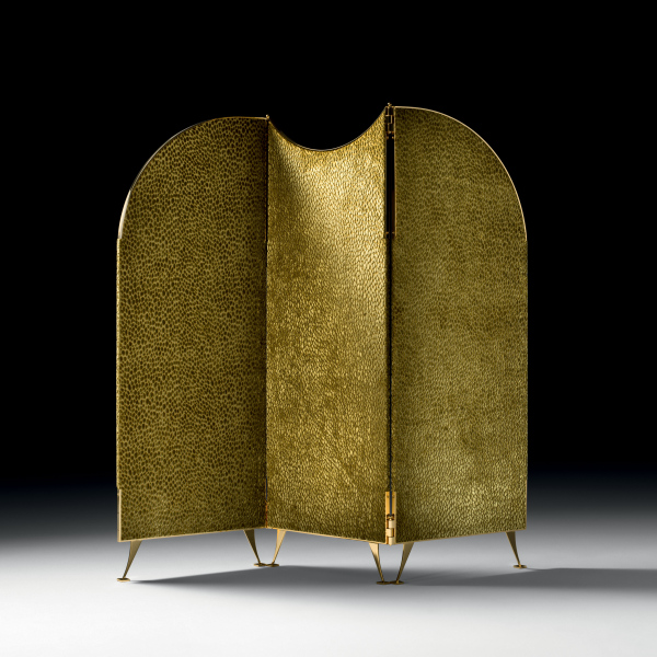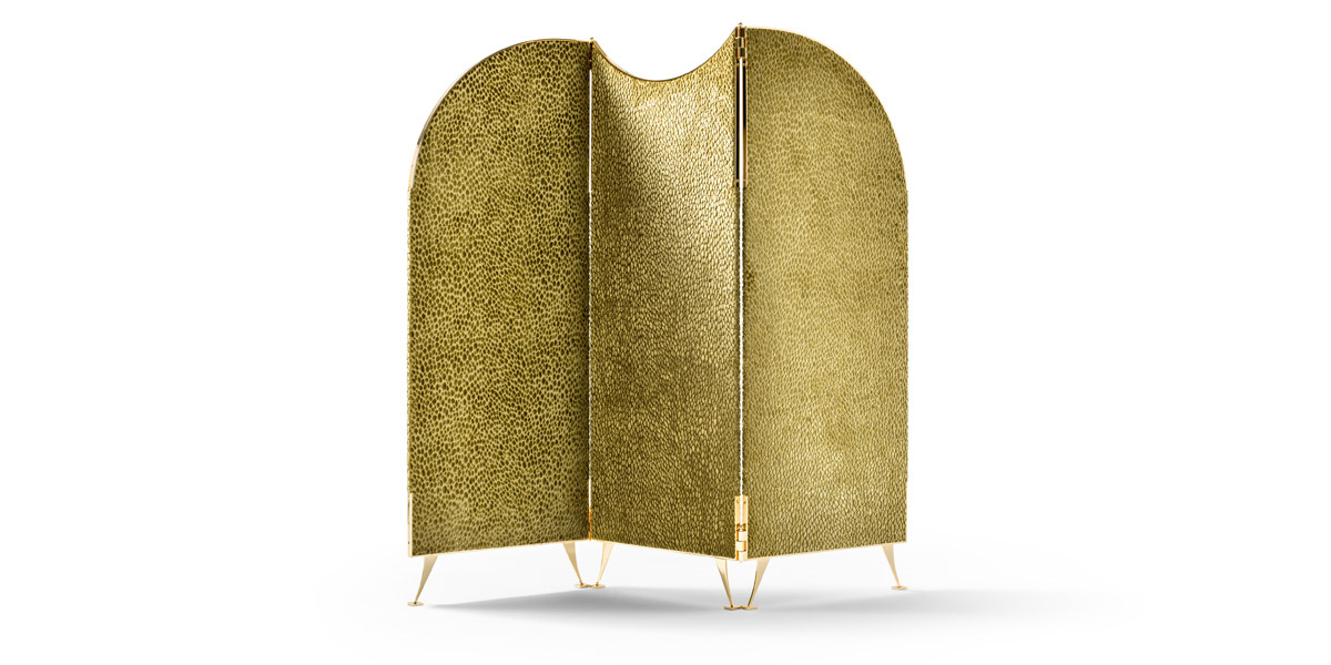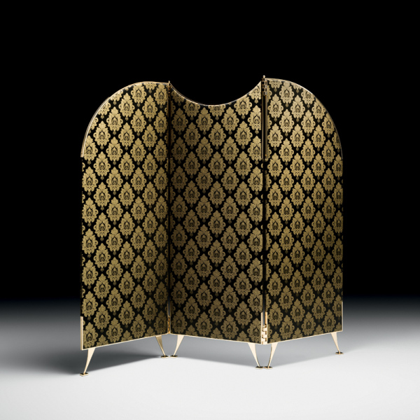 Paravento con struttura realizzata in multistrato di faggio, ricoperto con poliuretano e rivestito in tessuto.