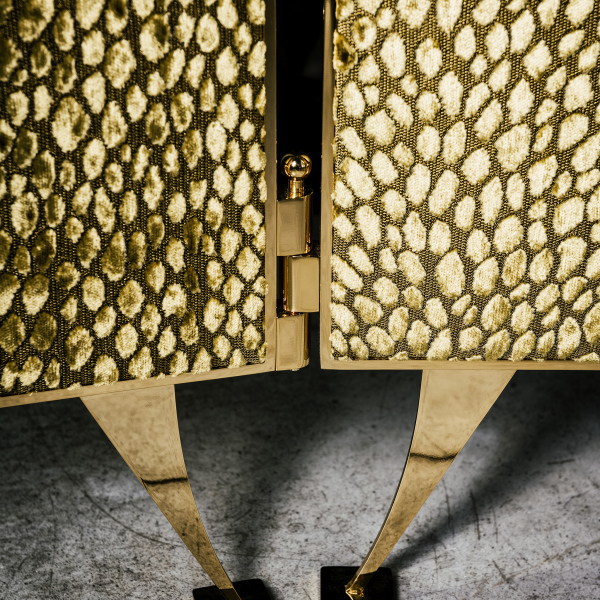 polyurethane, upholstered in fabric. Metal frame in polished gold finishing.