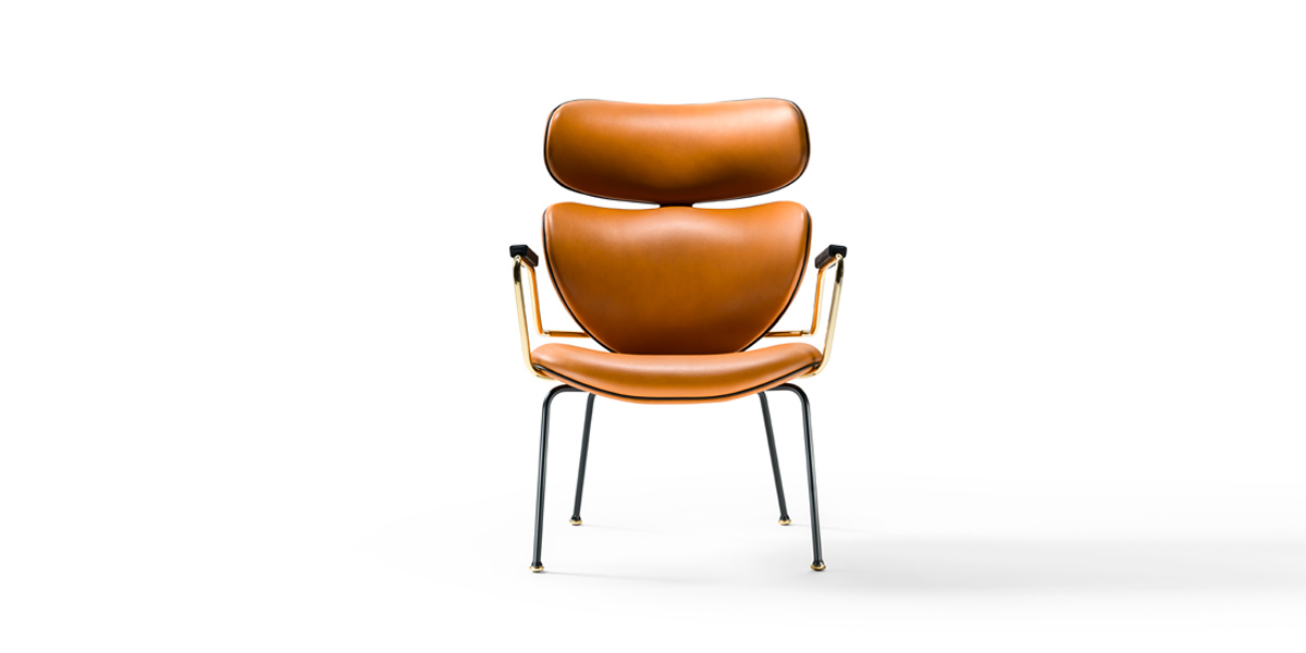 Armchair with frame in matt black-varnished metal rod. Glides metal polished gold. Seat, back in curved beech
