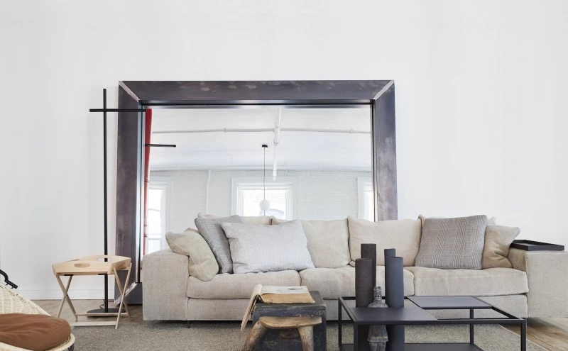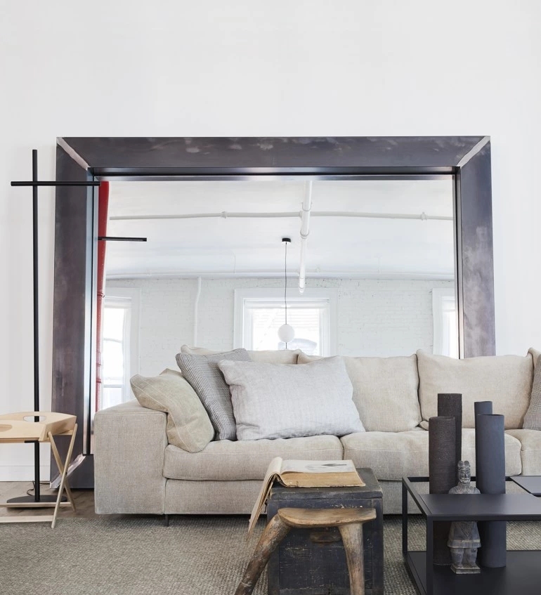 Rectangular mirror, to be placed on floor, with untreated sheet metal frame, available in fixed or customised dimensions (max. 2000 mm x 2500 mm high). The frame is protected against oxidation by the application of a transparent matt varnish. Design Piero Lissoni.