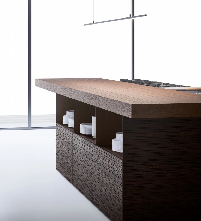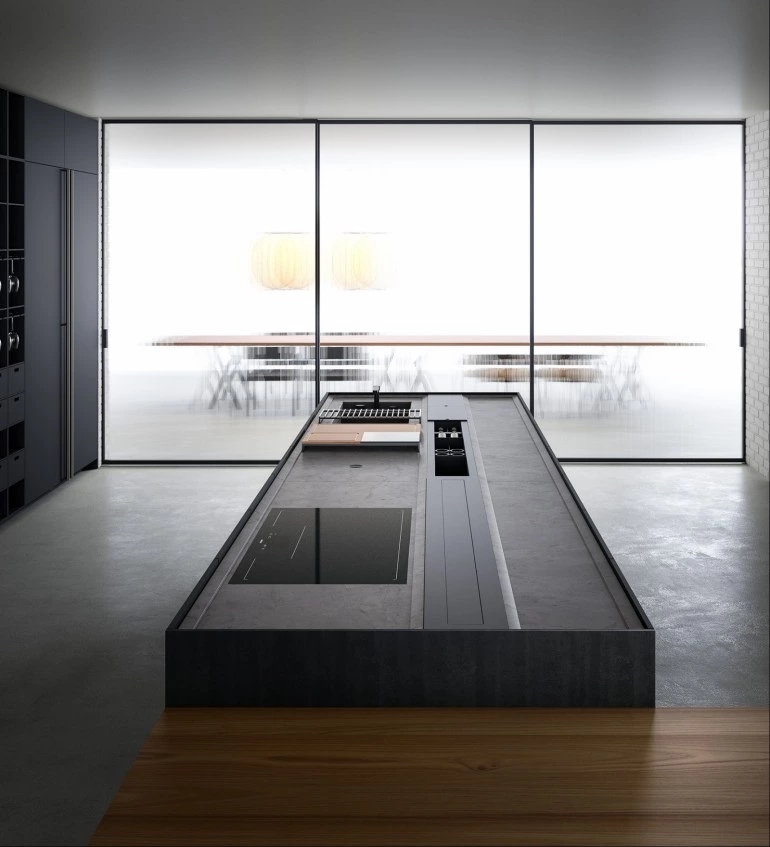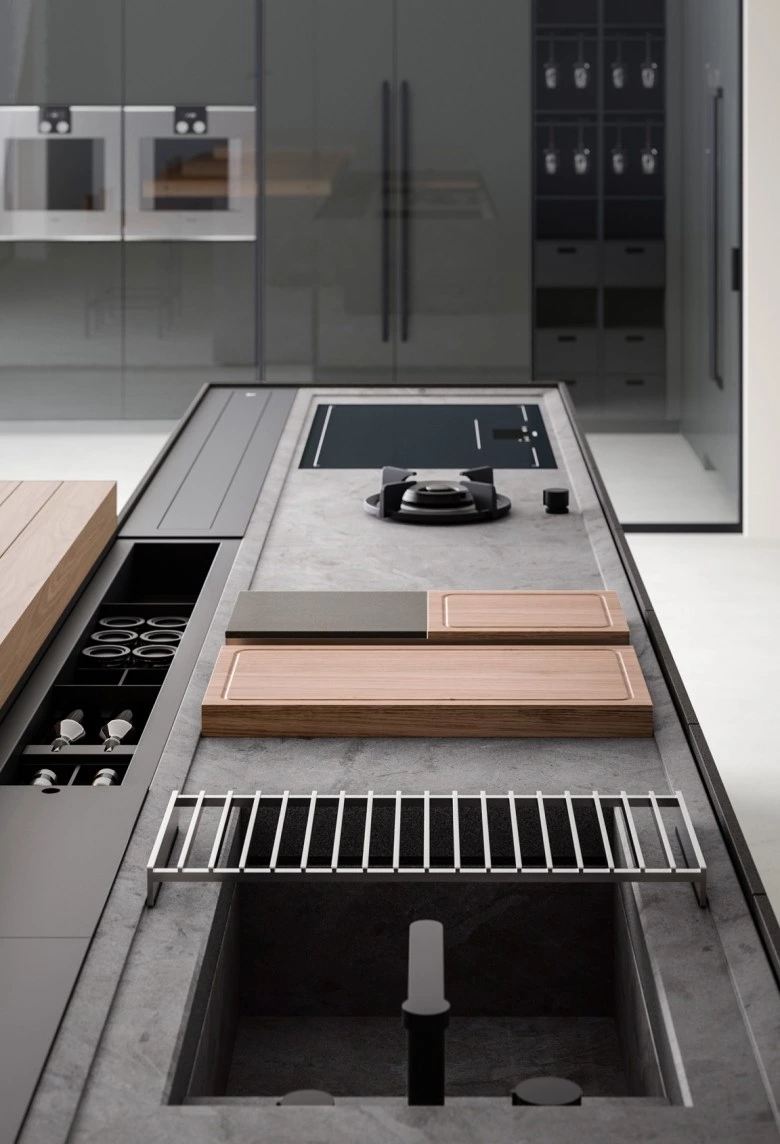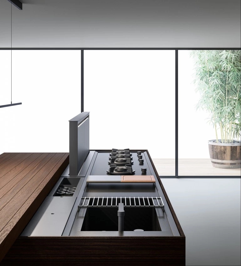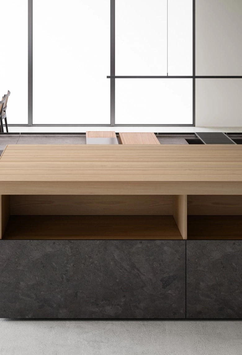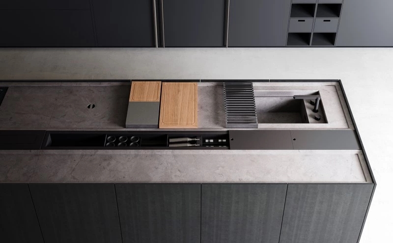 In the Evolution version, the Combine monobloc kitchen is enriched with new solutions, creating more composition possibilities and more function modules. The kitchen blocks for washing and cooking area and the block with preparation/working area are now connected by a metal structure equipped with wooden drawers, housing a big snack table made of solid wood staves. An equipped track for countertops, called Inside System, has been integrated in this kitchen. It is positioned in the back of cooking and washing areas, equipped with some sliding lids that cover storage compartments fitted with accessories of Inside series, such as cutlery trays, knives holders, spice holders, oil bottle holder, electric sets with hidden sockets. In addition to the totally integrated downdraft hood, the worktops house an elegant long hanging bar for ladles or other accessories, equipped with LED lighting. The higher doors than standard (+2 cm), make the monobloc kitchen even more sophisticated and monolithic. The surfaces and doors are available in the new composite MDI: a high-performance material, made of high-purity minerals soft to the touch and feasible in the two exclusive colours Devon (light grey) and Surrey (dark grey). This composite is hygienic and nontoxic, highly resistant, made of recycled materials, so totally ecological. Combine Evolution furnishes the environments, offering lots of compositional, functional and material possibilities to create a complete, sophisticated and contemporary kitchen system.