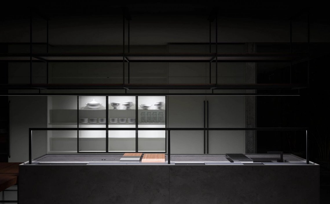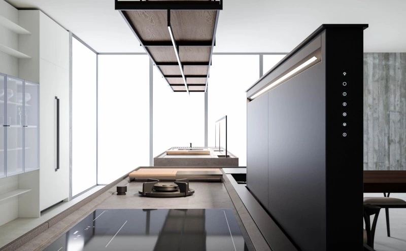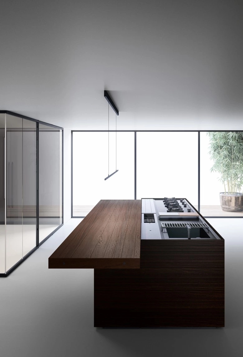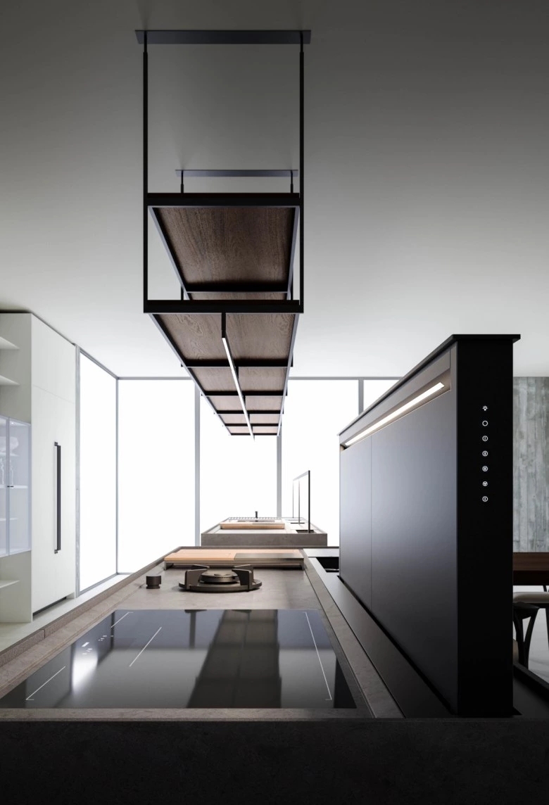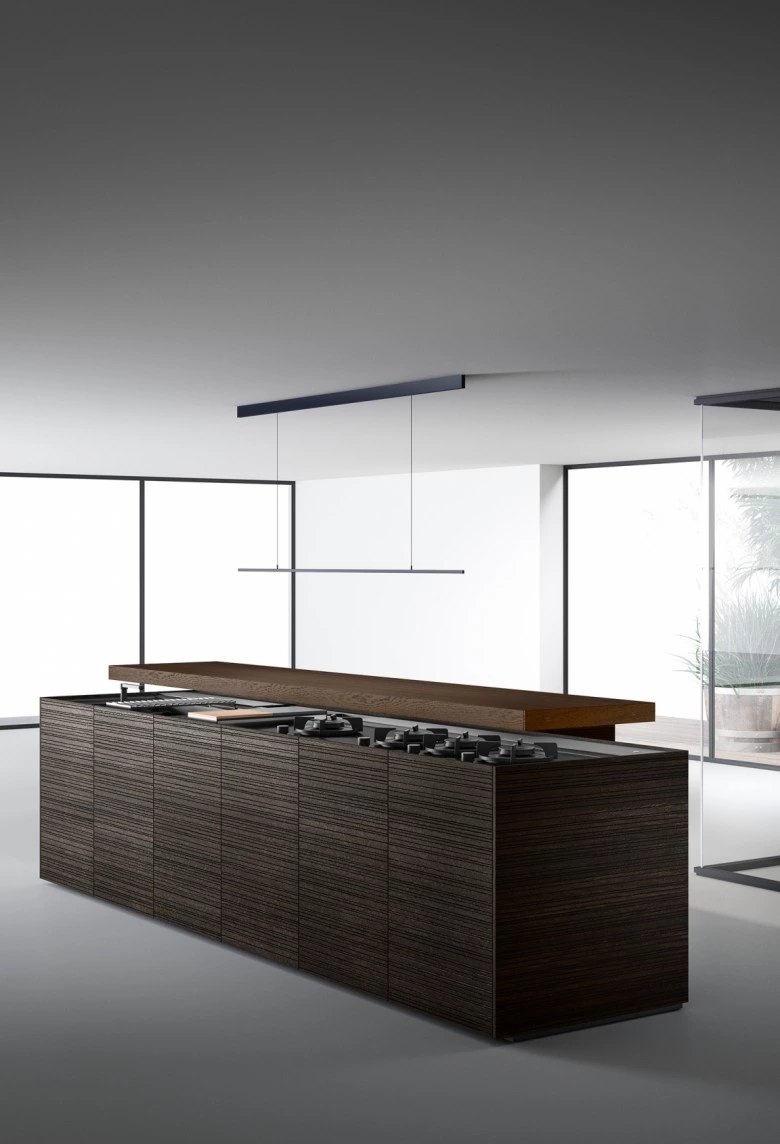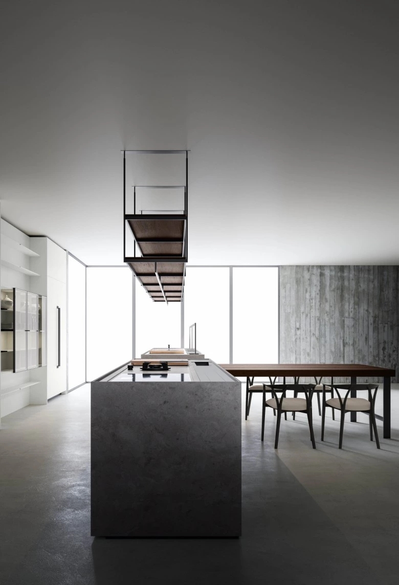 In the Evolution version, the Combine monobloc kitchen is enriched with new solutions, creating more composition possibilities and more function modules. The kitchen blocks for washing and cooking area and the block with preparation/working area are now connected by a metal structure equipped with wooden drawers, housing a big snack table made of solid wood staves. An equipped track for countertops, called Inside System, has been integrated in this kitchen. It is positioned in the back of cooking and washing areas, equipped with some sliding lids that cover storage compartments fitted with accessories of Inside series, such as cutlery trays, knives holders, spice holders, oil bottle holder, electric sets with hidden sockets. In addition to the totally integrated downdraft hood, the worktops house an elegant long hanging bar for ladles or other accessories, equipped with LED lighting. The higher doors than standard (+2 cm), make the monobloc kitchen even more sophisticated and monolithic. The surfaces and doors are available in the new composite MDI: a high-performance material, made of high-purity minerals soft to the touch and feasible in the two exclusive colours Devon (light grey) and Surrey (dark grey). This composite is hygienic and nontoxic, highly resistant, made of recycled materials, so totally ecological. Combine Evolution furnishes the environments, offering lots of compositional, functional and material possibilities to create a complete, sophisticated and contemporary kitchen system.