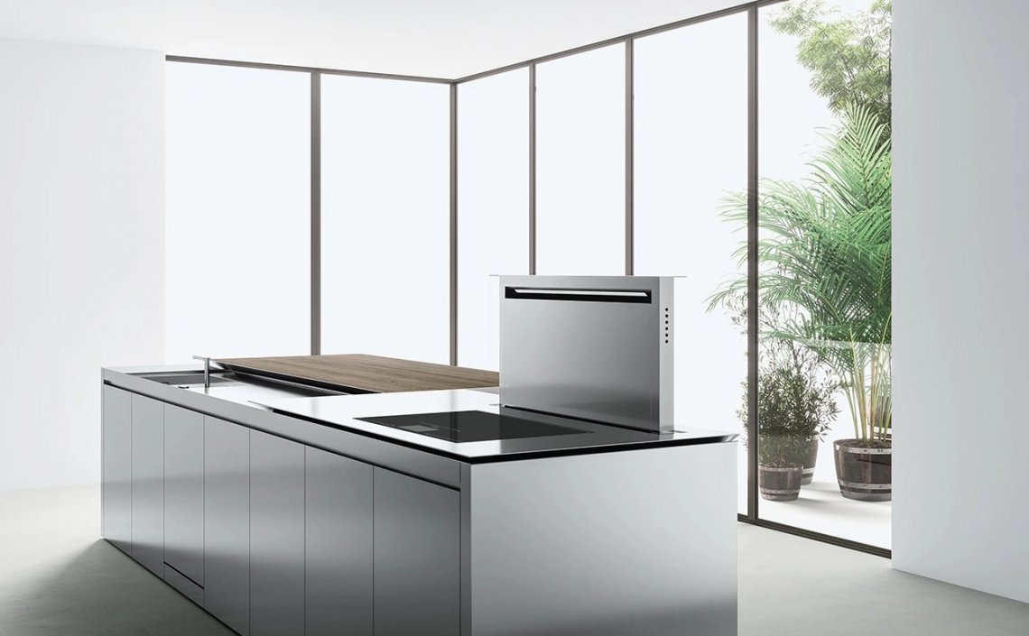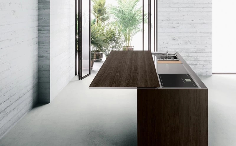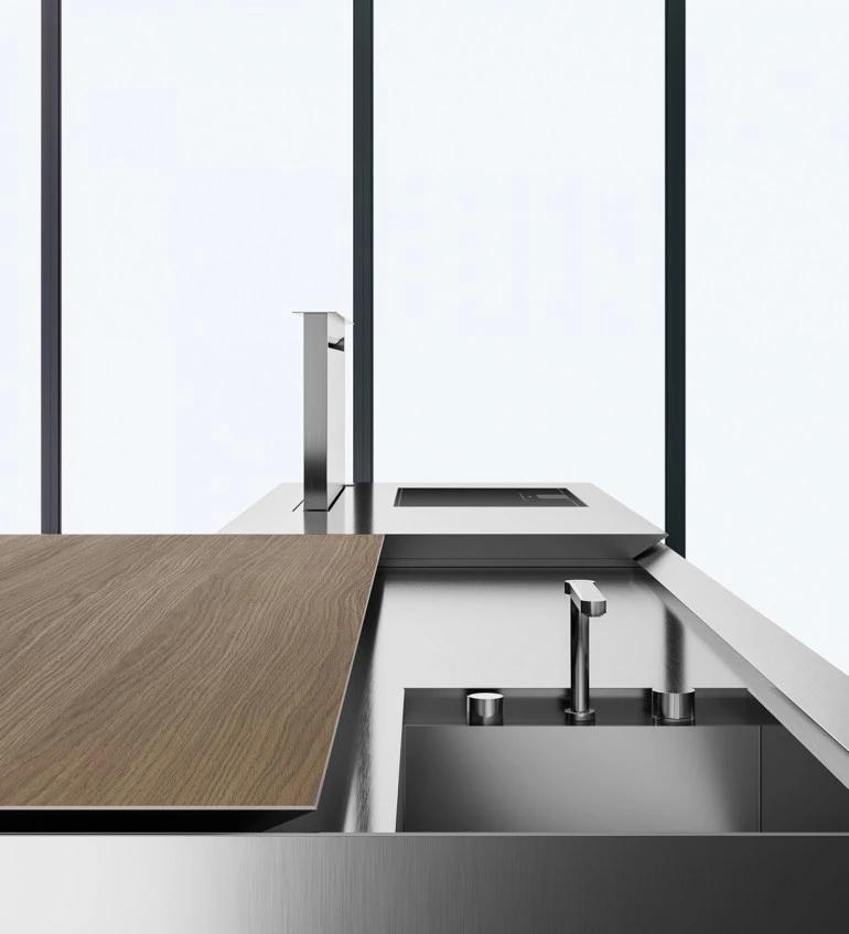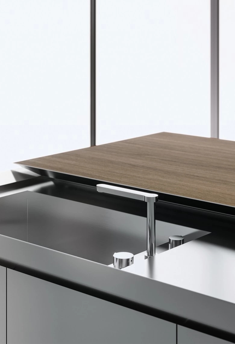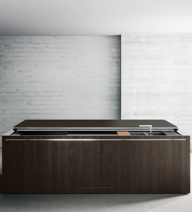 The Norbert Wangen’s kitchen cube design, presented in several shapes and dimensions, revolutionises the concept of the compact kitchen. K6 kitchen, together with K5, represents the development of the original concept of K2, K3 and K4 models: a single stand-alone monobloc that contains all the necessary elements for cooking, with a sliding top able to conceal the working area when not in use and to turn into a snack bar for serving and sharing food when open. The K6 is available in monobloc version or composed by two blocks, with a sliding worktop along the backside that conceals the fixed working surface below, becoming a protruding useful surface. The sliding worktop of the monobloc version covers totally the washing and cooking areas, while the version with two blocks features the cooking area with fixed surface, that is not covered by the sliding top as for the washing block. Thus, when the sliding worktop is closed, it is uniform and totally linear.