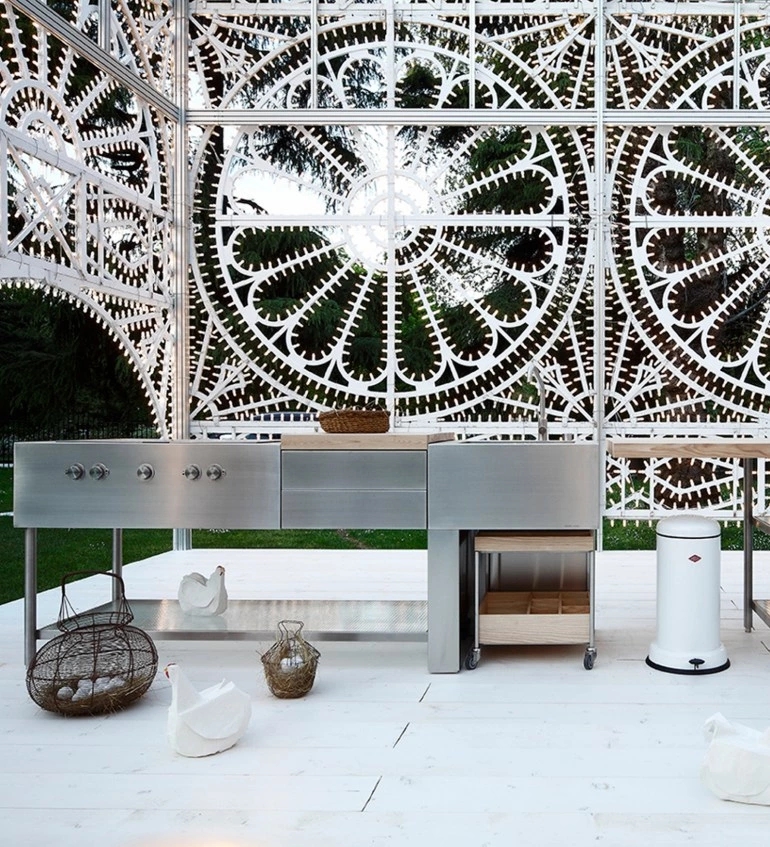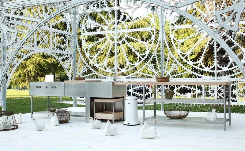 It is a minimalist kitchen consisting in an open-faced structure, specifically engineered for external use. The designer Piero Lissoni declared “Open is not a kitchen, it's much more. It's a machine, for preparing dinner, having a drink, listening to music, chatting with friends, cooking a meal or enjoying a good dish. The bodywork of this machine is in brushed stainless steel, natural woods and industrial-grade glass.” The core of Open is the AISI 316 stainless steel monobloc for cooking and washing. In the centre of the composition there is a removable chopping board in solid Iroko wood and below are housed two drawers. The block is supported by tubular steel frame with a shelf in transparent wired glass. The set is completed with a trolley on wheels to be placed under the sink, with a matt satin stainless steel structure, composed by 3 upper and 7 lower compartments in solid Iroko wood. The cooking and washing block can be combined with a large snack counter in solid Iroko, supported by a tubular steel structure equipped with two lower shelves in wired glass.