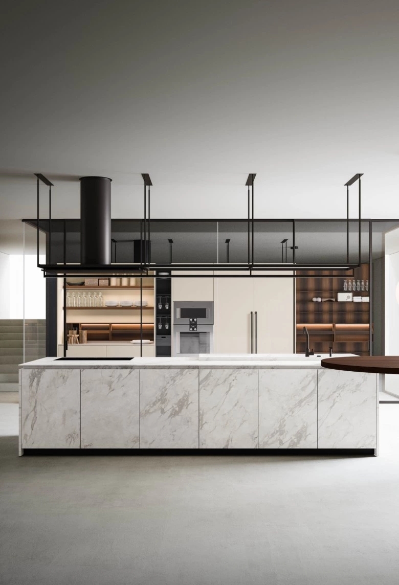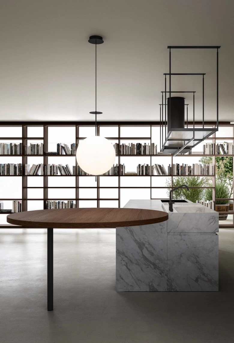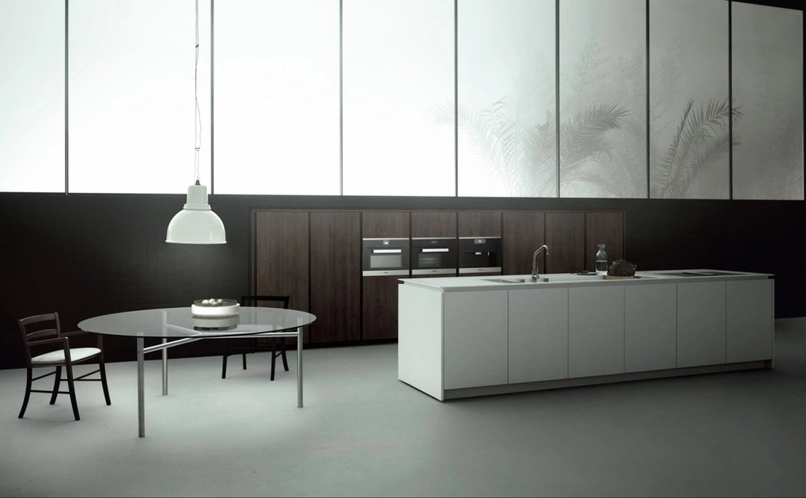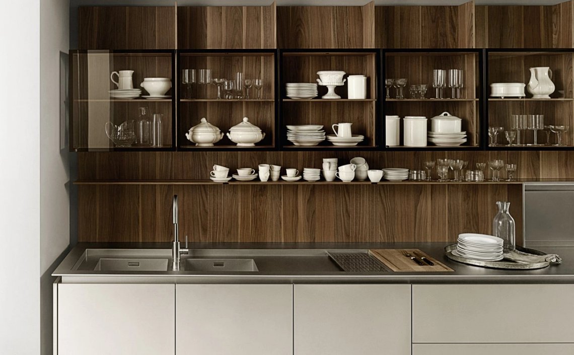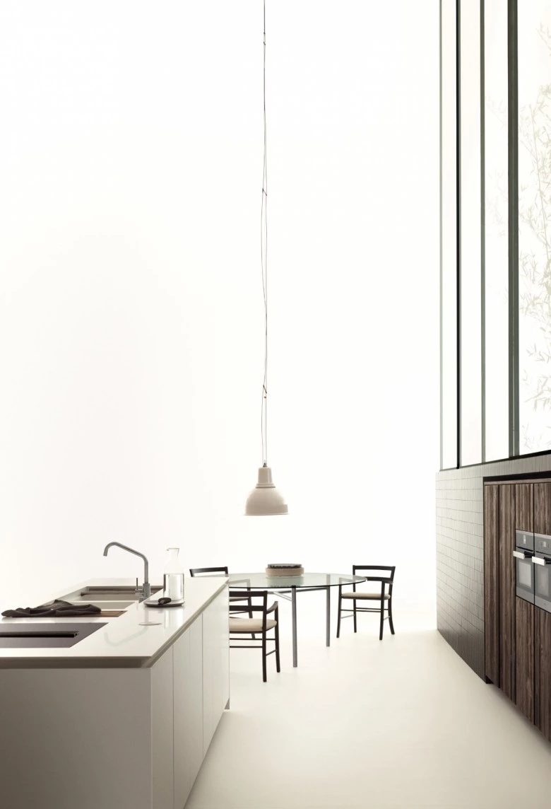 The APR60 is a functional, rational, spacious and sober kitchen, conceived to sit into an open living area or a dedicated space. Its final essential look follows the tastes and needs of those who choose it. Focused on efficiency and formal cleanliness, the APR60 kitchen can create your own desired style and detail design. The base units with hobs, washing areas and the cabinets with fronts or heavy-duty drawers are completed with back panels or wall panelling systems with shelves and wall units, open-faced or with doors. APR60 is characterised by handless base units, where the upper protruding part of the doors is used as handle. Two details specify this kitchen: a raised worktop with a special section that creates a gap with the door and the extra thin shelves that look like simple drawn lines. The aesthetic interpretation is therefore left to the choice of materials where a contrast can be achieved in mixing wood and glass or steel and wood or different colours.