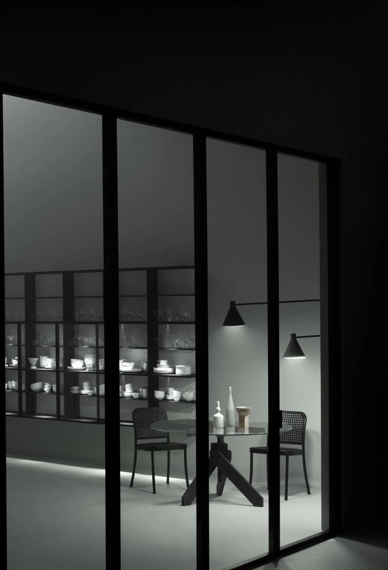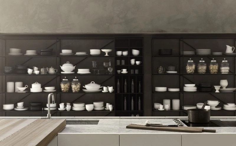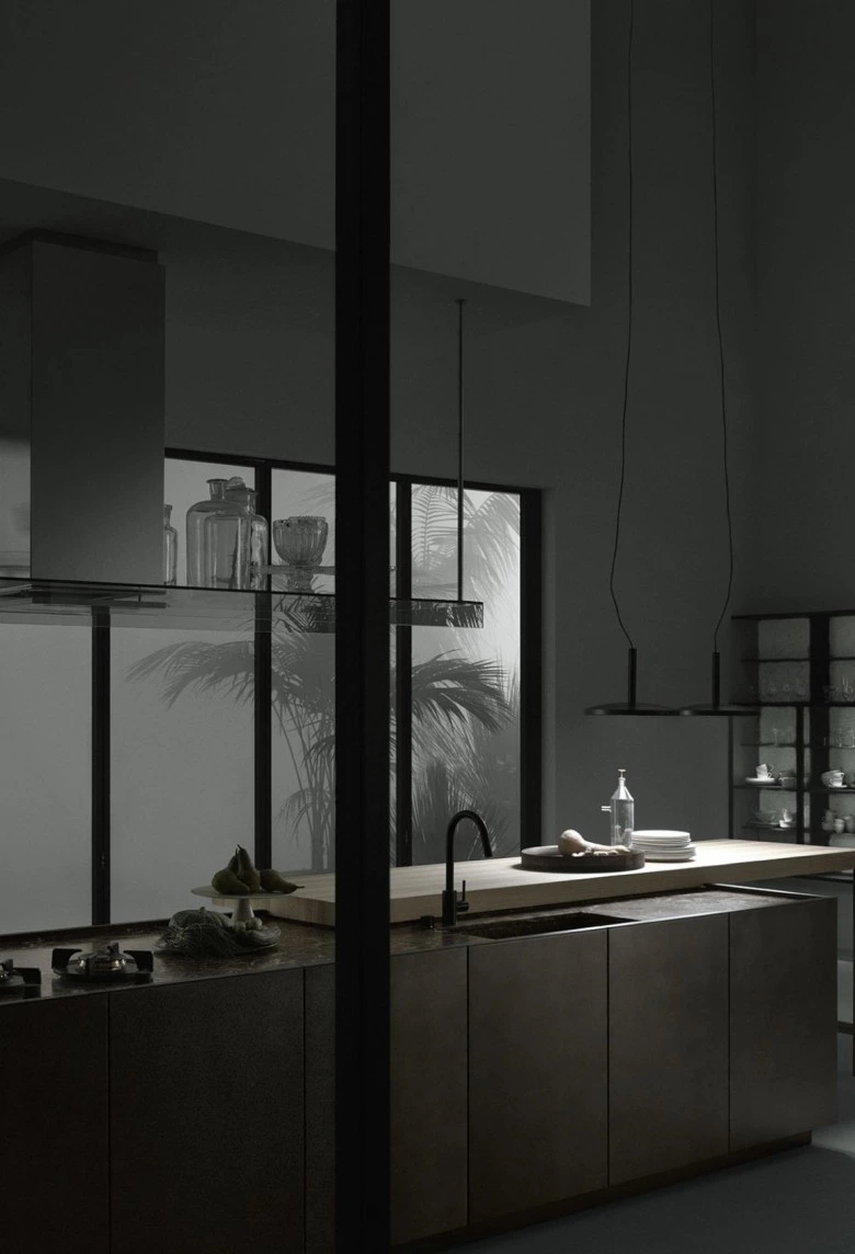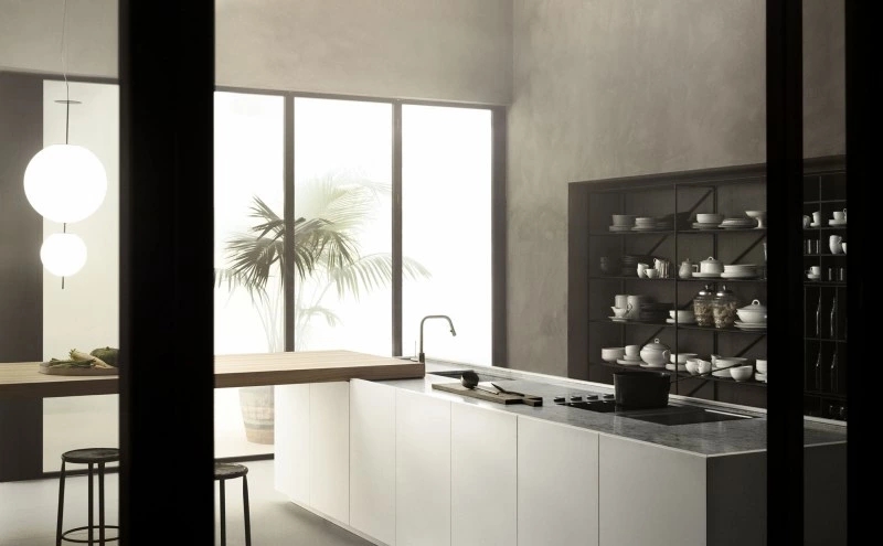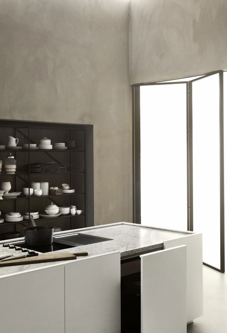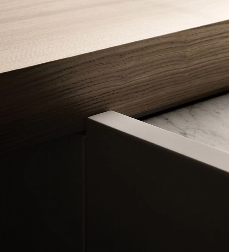 The K21 kitchen model originates from the innovative concept of the designer Norbert Wangen who, in the K series designed for Boffi, has transformed the concept of compact kitchen. The wall or peninsula/island modular base units have no handles: the door opening is guaranteed by the particular wrapping shape of front panels that hides, with close doors, the worktop thickness giving an extremely defined and monolithic appearance to the composition, highlighted by the worktop with basin effect. The front opening is allowed thanks to the upper protruding part (on the worktop) of the front itself. A middle handle-rail in extruded aluminium is set when drawers and heavy-duty drawers are used.