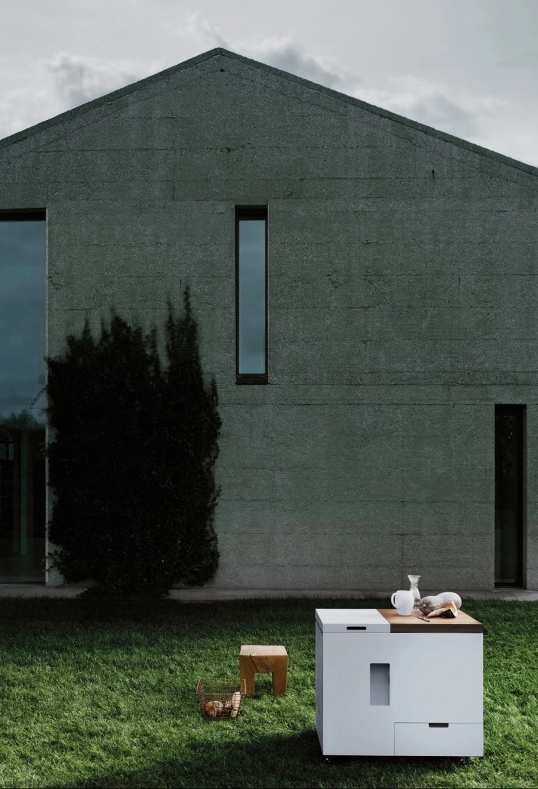 The compact mini-kitchen on wheels that Joe Colombo designed for Boffi in 1963, which has become an icon of the Italian design, is also available in the version for outdoor use (sheltered environments). The self-bearing structure is made of marine plywood covered by white or black Lasermat, a 'soft touch' matt nanotechnological surface (Fenix NTM?), with visible trims in marine plywood. Minikitchen Outdoor is completed with electric hob, fridge (60 liters), two fully extractable drawers, internal cutlery drawer, sockets for small appliances, large chopping board in Iroko wood and tray. The protective outdoor cover is made of marine technical textile.