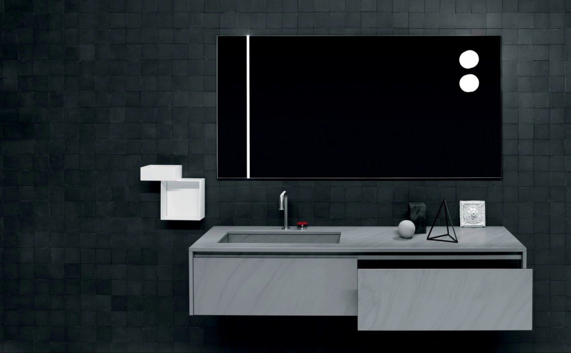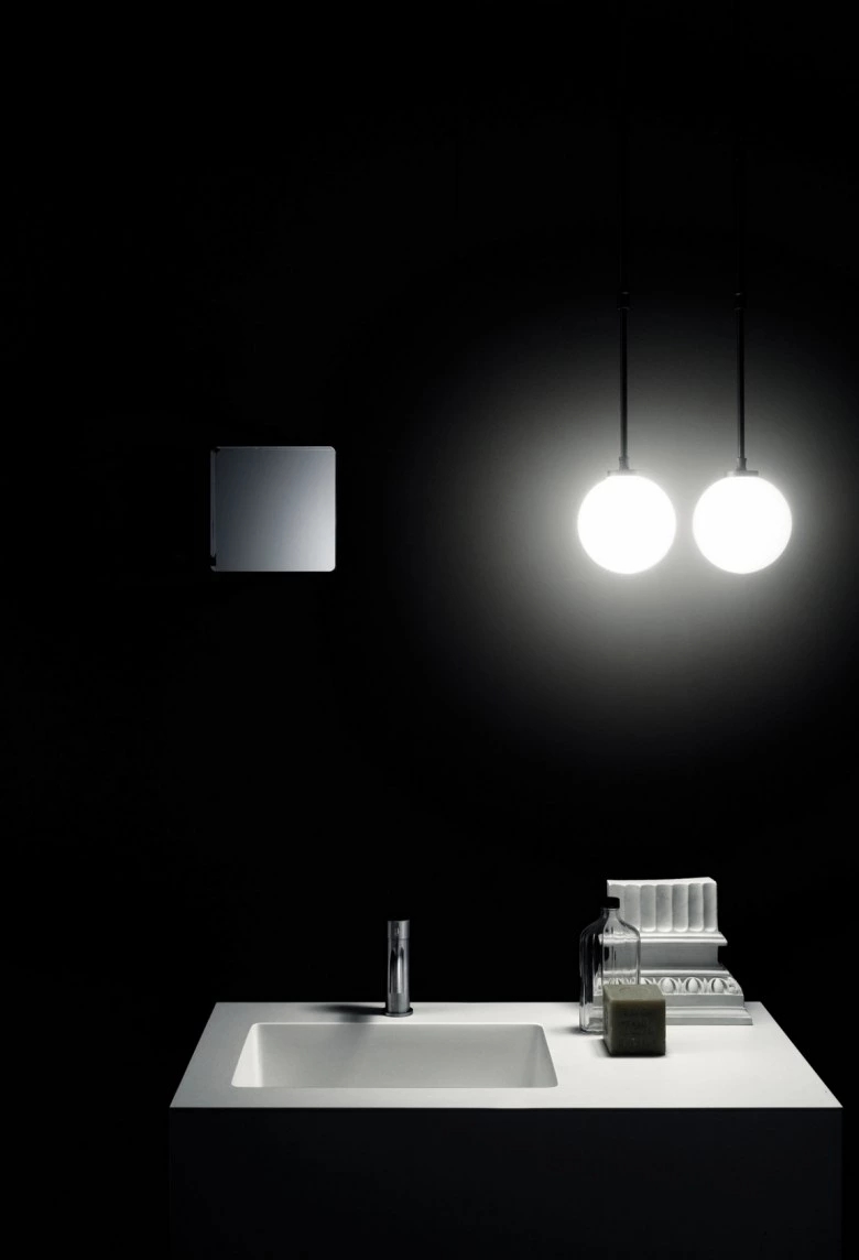 Group of pendant, wall and table lamps characterised by opal glass diffusors. In the pendant version, the sphere diffuser (150 mm diameter, halogen lighting) is fixed to the end of two telescopic rods in matt black anodised aluminium, adjustable in height. Once adjusted, the exceeding cable can be rolled up and clipped with a black clip provided, remaining visible. In the wall-mounted model, the opal glass diffusor has a characteristic slightly flattened spherical shape and is supported by a white painted aluminium ring. A table version of this model is also available with a switch integrated on the cable. The lighting can have a halogen or dimmable LED source. Design Piero Lissoni