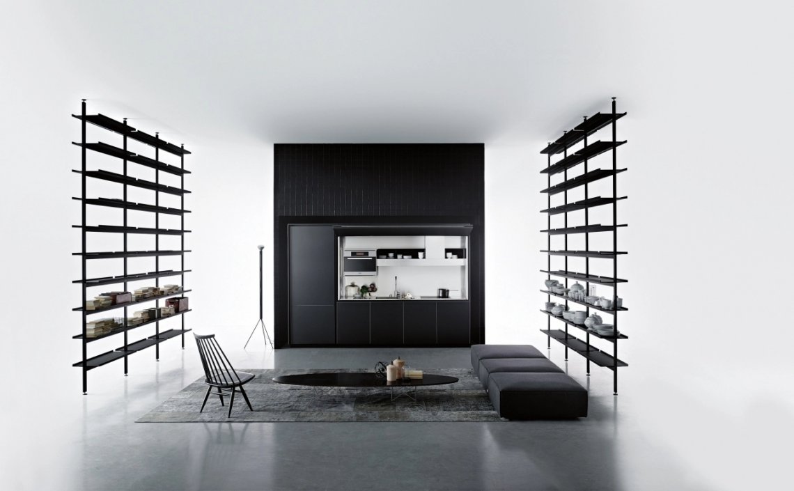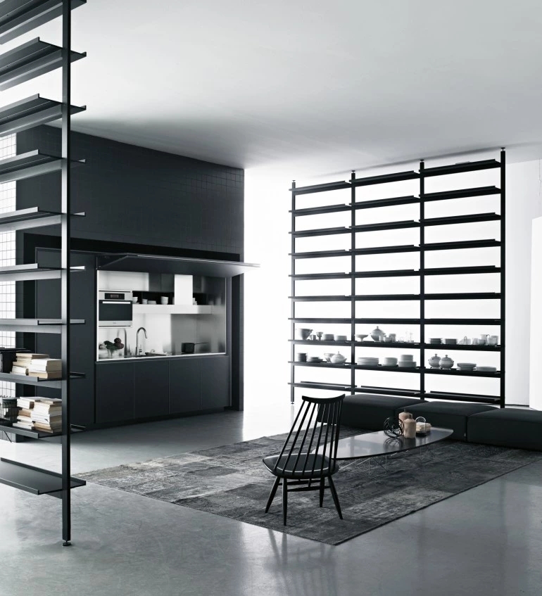 The ON-OFF ST modular kitchen is characterised by a self-standing structure equipped with folding door, which opens upwards electronically, revealing the worktop area inside. Once closed, it completely conceals the working area, transforming the kitchen into a monolithic furniture piece. The base units are available with or without handles and a tall unit with side-recessing door can be positioned next to them. The working area can be fitted with back panel, shelves, open-faced units, hood and a suspended compartment for oven. The oven can also be installed in tall unit.