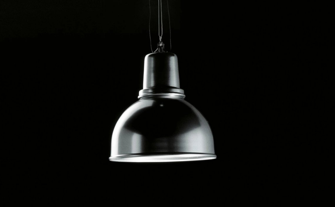 Pendant lamp with semi-spherical lampshade made of spun aluminium in natural, cream or black painted finishes. Arranged for halogen lamp. Design Piero Lissoni.