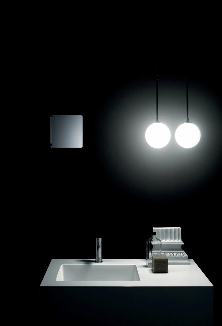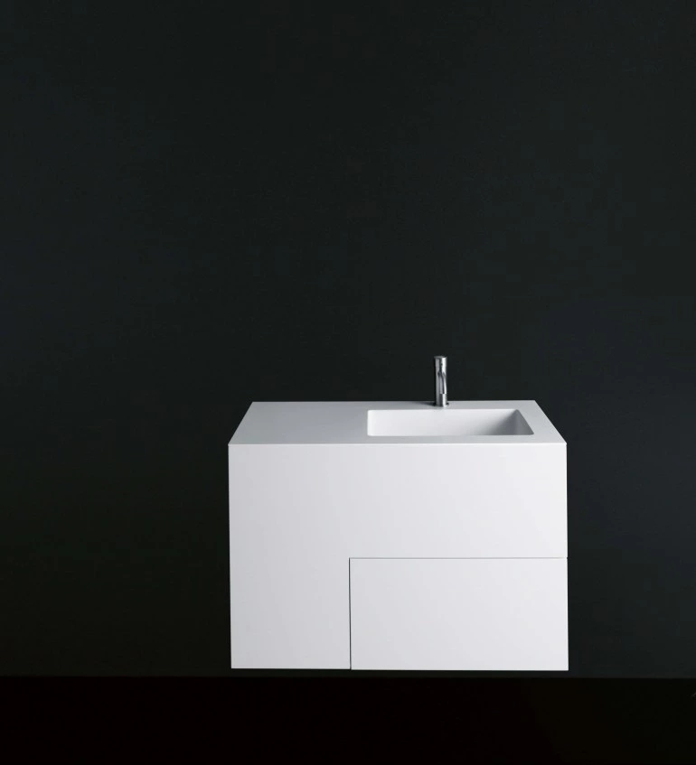 A compact, suspended washbasin base unit with integrated containing compartments, conceived as a solution to tight bathroom areas for both residential and commercial uses. The cabinet, made of MDF (Medium Density Fiberboard), is available in matt lacquered Silcover finish, in full colour range, completed by a top with washbasin in white Cristalplant?. A large front drawer, a side drawer with an additional internal drawer and an open compartment have been created inside the base unit for storage. The washbasin can be installed left or right hand.