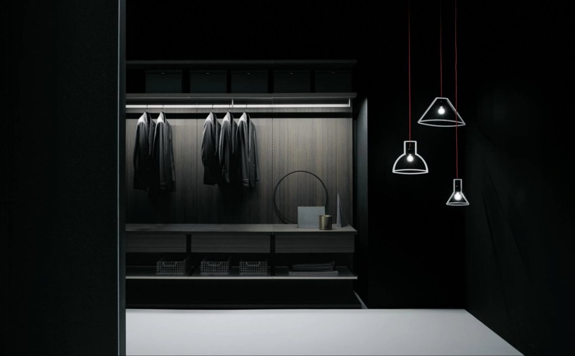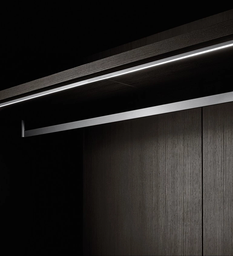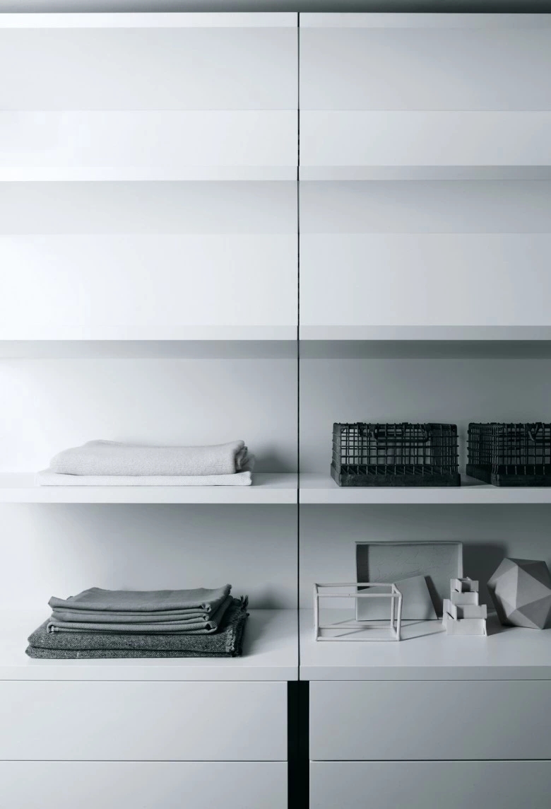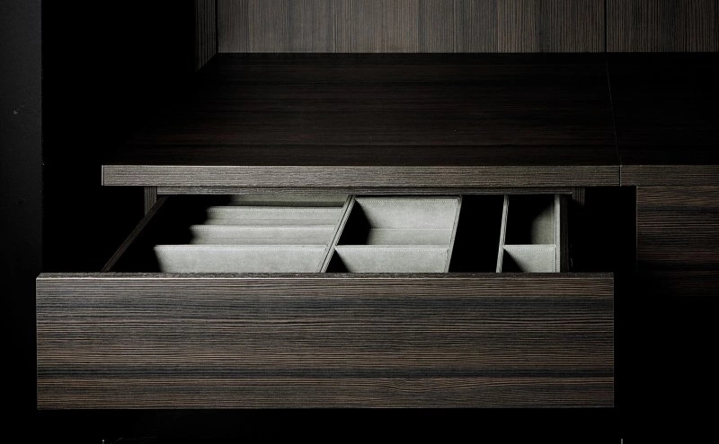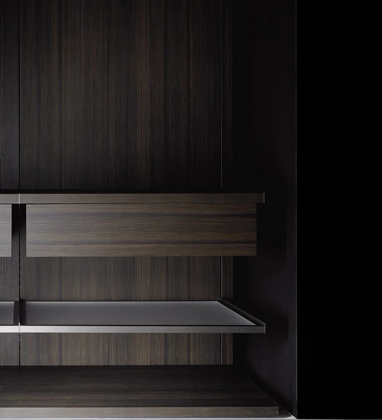 Modular system for walk-in closets, equipped with accessories and without visible side panels. The structure consists of natural anodised aluminium uprights that can be equipped and completed with back panels, bases, shelves and suspended drawer units in melamine, lacquer or wood veneer finish in the range of colours and woods selected for this boiserie panelling. The shelves can also be made with a bronzed or black aluminium frame with a glass bottom. A lot of accessories can be proposed for Antibes boiserie including pull-out trouser holders and bronzed aluminium hanging clothes rods, as well as LED lightings. The internal multifunctional accessories for drawers are available in black-dyed ash wood and dove-grey velvety microfibre. Single- or double-sided island drawer units complete the wall-mounted boiserie panelling system; they can have a tubular metal base structure too. Their drawers, with tip-on push opening, are available in lots of finishes including mirror and can feature open-faced compartments equipped with pull-out trays. The Antibes boiserie panelling can be completed with Antibes wardrobe compositions. Design Piero Lissoni.