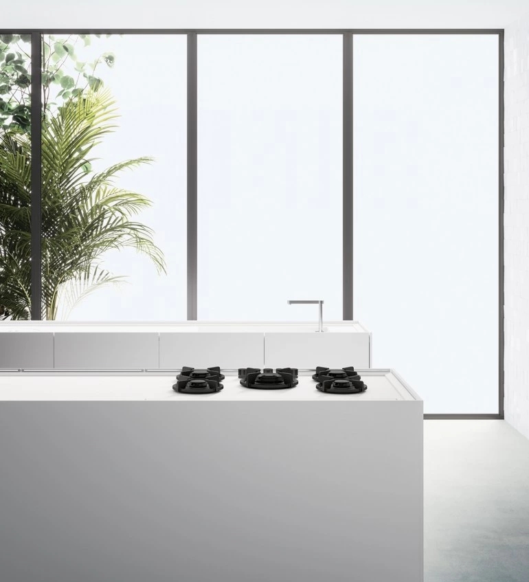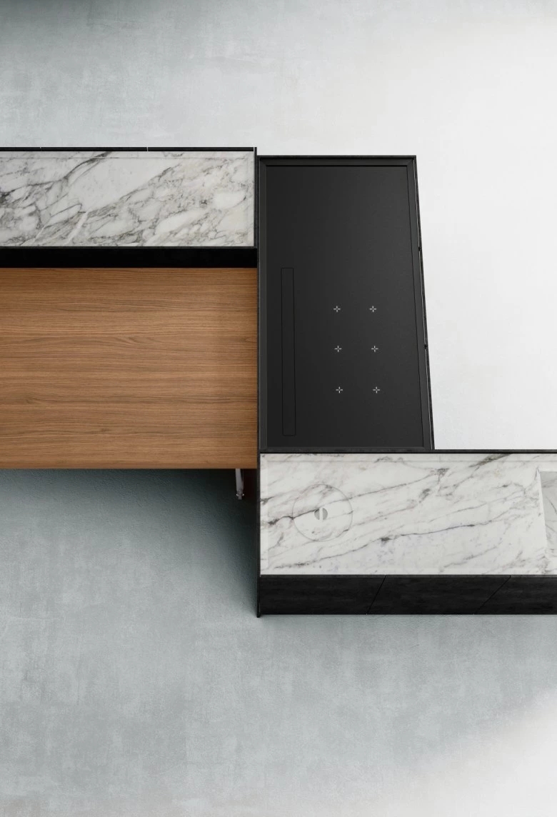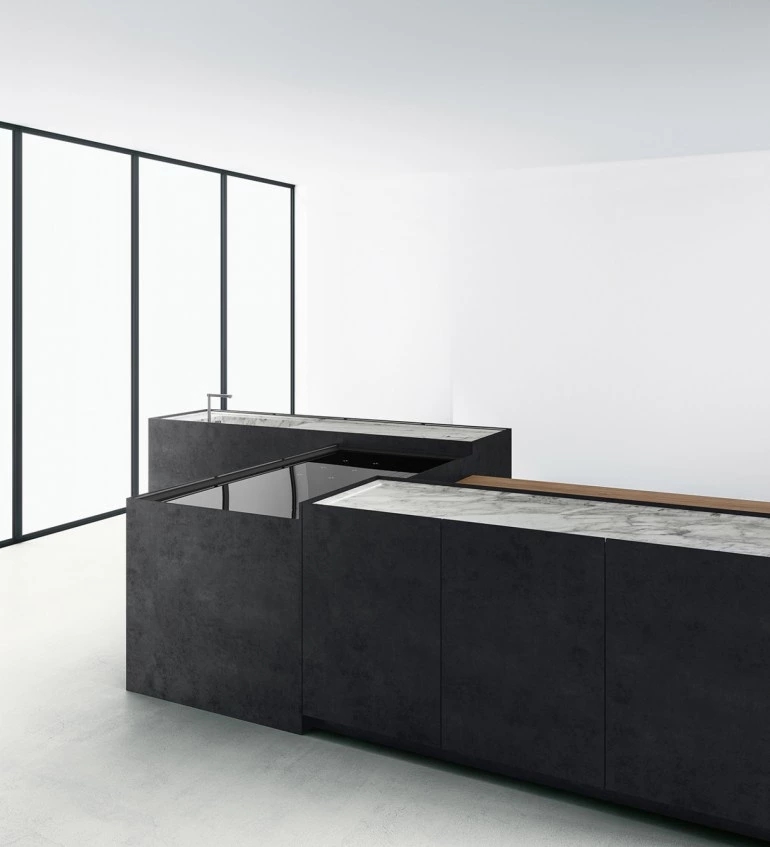 The Combine programme blends the compact kitchen to the traditional kitchen island, offering functional monoblocs with pull-out doors. Each bloc has a specific use: two are technician areas – one for cooking and one for washing – and one suits for preparation. This setting allows great freedom of composition, whether linear, angular or zigzag. Combine kitchen can be completed with protruding or extractable tables, thus integrating the dining area into the kitchen work area. The extremely light and thin door profiles are opened by gripping the upper part of the door, which protrudes from the bevelled worktop, internally tilt to its surface. They enhance the formal and compact design of the linear and monolithic blocks. The hob is available in glass ceramic with induction stoves and an area suitable for wireless charging. A flush-mounted integrated downdraft hood completes the worktop. A wide range of materials are proposed for worktops, such as the extremely resistant Durinox? Gunmetal micro-sandblasted steel, a product derived from aerospace technology: the surface is scratch-resistant and stain-resistant, matt and velvety to the touch. Design Piero Lissoni.