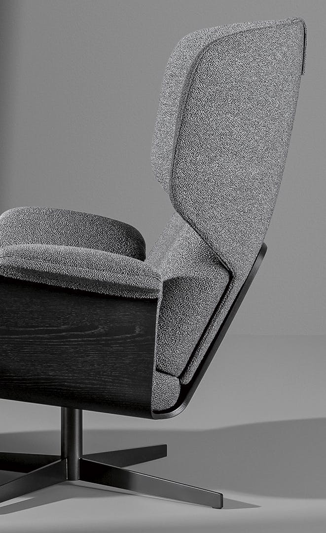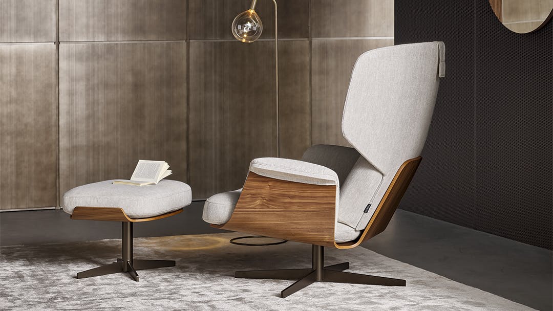 The Olos bergère armchair combined with the Olos footstool complements the Olos collection helping to make it both coordinated and harmonious. The new bergère design armchair offers considerable levels of relaxation, characterized by contours that indicate a lifestyle that is elegant, rigorous, serene and casual all at the same time, presenting a reinterpretation of mid-century modern design that reminds us of the authenticity of curved lamellar woodworking. Like a protective shell, the gentle smoothness of the curves of the supporting wooden frame combines with the sinuous roundness of the padding, making the generous level of comfort on offer evident at first sight, welcoming you enticingly with its essential forms.