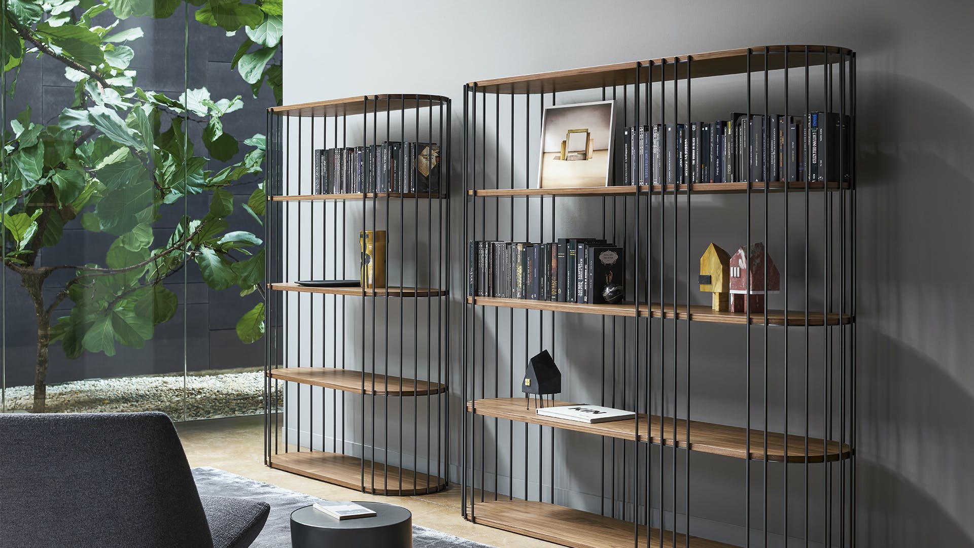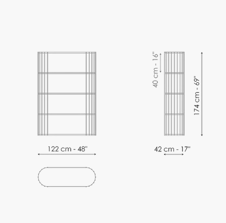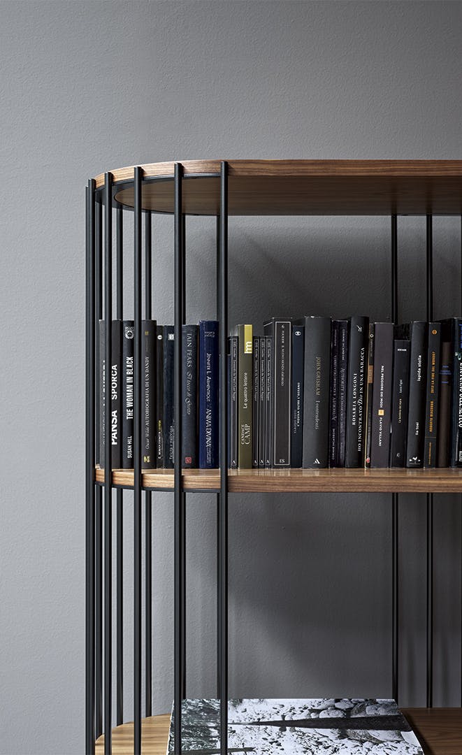 A versatile instrument for contemporary furnishing, Arpa displays a “musical design” that lends itself to infinite interpretations, combining visual lightness and functionality of use. The design bookcase, whose name in Italian means “Harp”, is characterized by the sequence of metal uprights arranged along the perimeter, which acts as a structure and support for the wooden shelves which run uninterrupted along the entire length and width of the piece. The rounded ends of the shelves soften the profile of the bookcase, making it ideal for any space, whether domestic or otherwise.