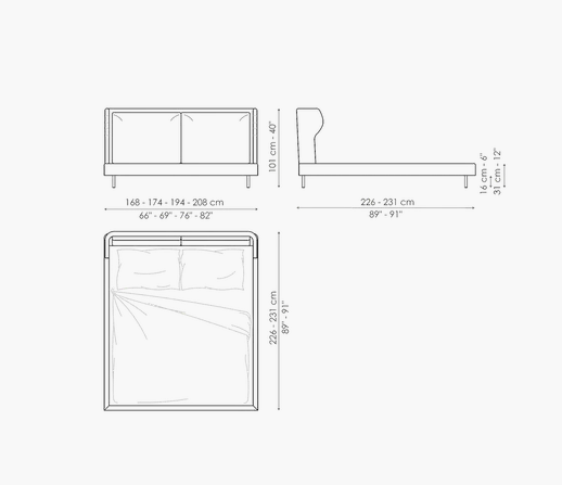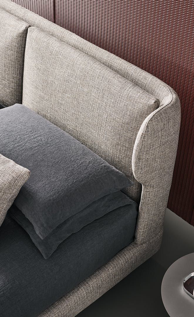 The headboard is the true visual focal point of the River double bed, soft and suggestive: the side “wings”, continuation of the front section, are a decorative element and quite cosy. It has great customisation potential, thanks to the choice of numerous fully removable covers available in fabric, leather or eco-leather. A contemporary bed which is perfectly at ease in environments with different aesthetic characteristics and which feels “at home” both in traditional furnishing solutions and when combined with contemporary design elements. It is the details that characterise a piece of furniture such as the River modern bed: the elegant quality of the workmanship, the materials used and the range of ?nishes available. The aesthetic point of reference is harmony: the pleasing elegance of the ornamental lines of the headboard is matched by the sobriety of the bed frame and the lightness of the metal feet, available in different colours and ?nishes.