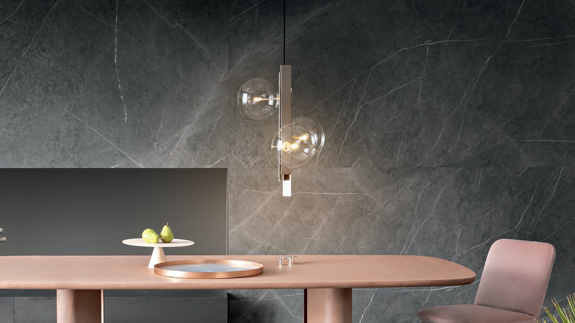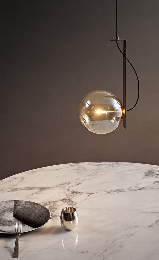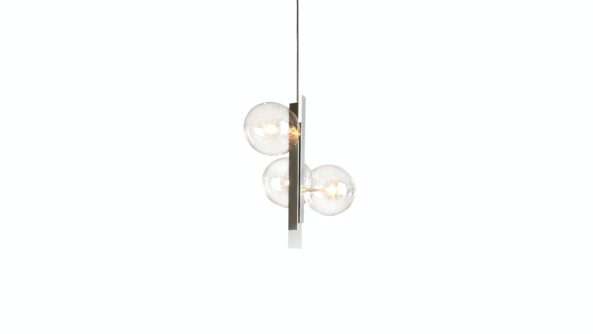 The Bon Ton pendant light, conceived by Studio Team Design, develops around its central axis, consisting of three metal blades in brushed nickel or in the elegant copper-bronze finish. It is an object in which the glass globes that form the lampshades, available in transparent, amber or smoked glass, are arranged in an irregular order, accentuating their dynamic nature. Bon Ton is available in a single globe version or in the three, six or eleven lights version that give further movement to the figure of the lamp.