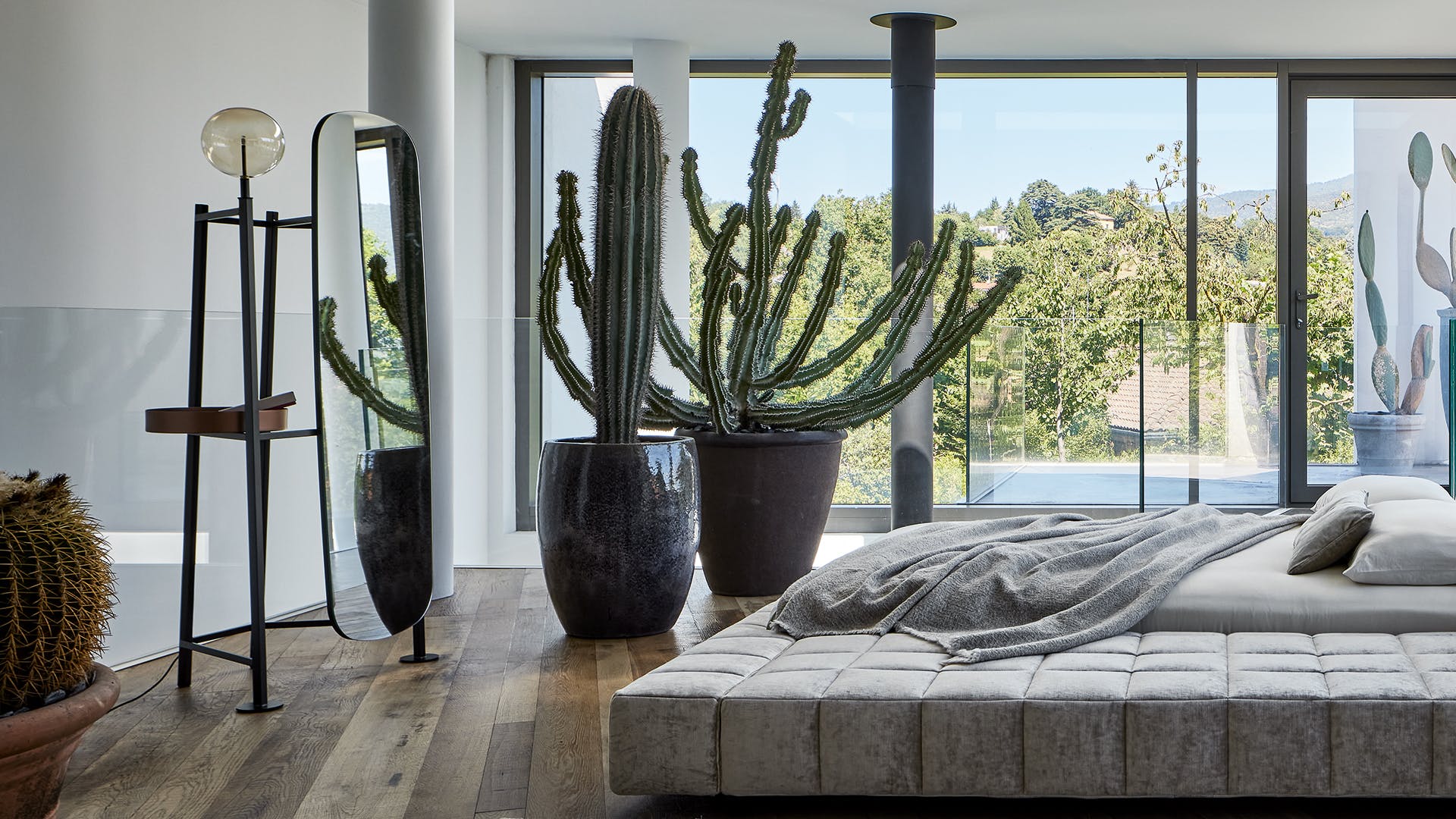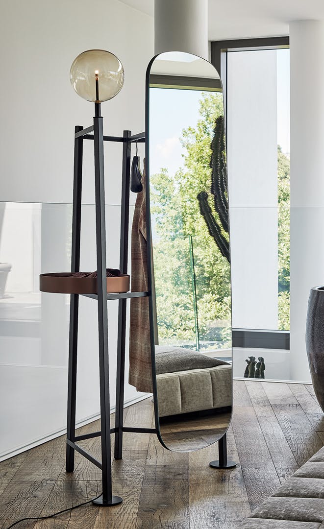 Perfect in its dynamic as a holder, every detail of the Salomé clothes valet stand contributes to the overall balance. Its design consists of delicate geometric shapes marked by precise vertical signs in which the luminous patterns of the transparent globe seem to dance with mirrored re?ections. Lights, lines and materials as fundamental features of an object destined to perform a daily service that becomes an emblem of an intimate relationship with the sleeping area: the beauty of the Salomé bedroom valet stand lies in the charm of the harmony between the forms and the intensity of its presence, a strongly scenographic design. The Salomé valet stand comes with a metal frame and tray in different finishes. A version with lampshade is also available.