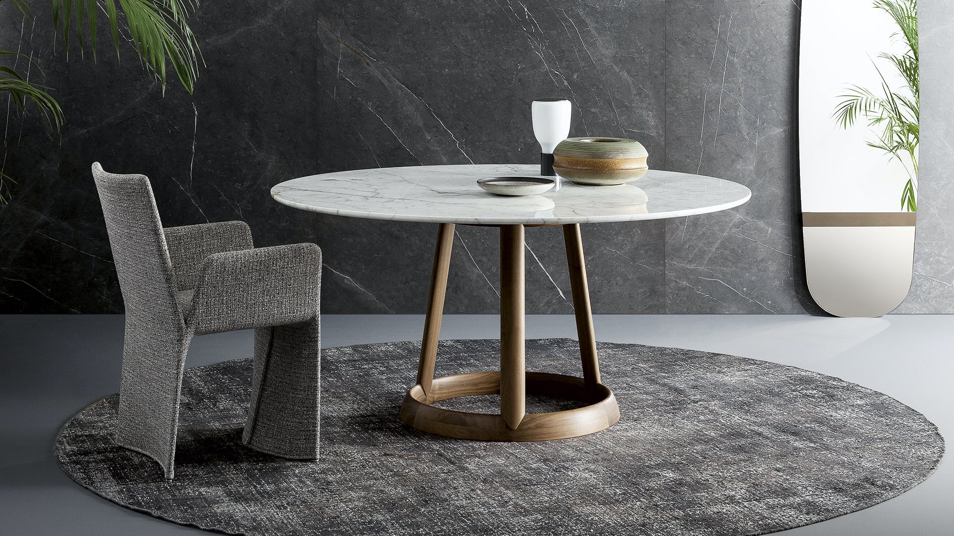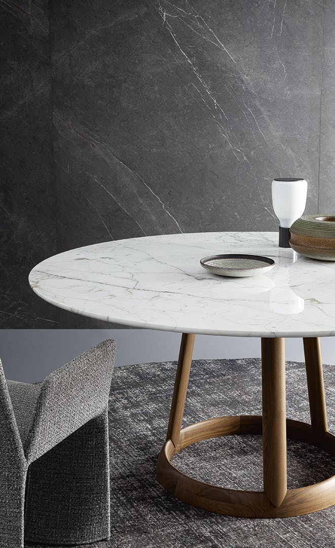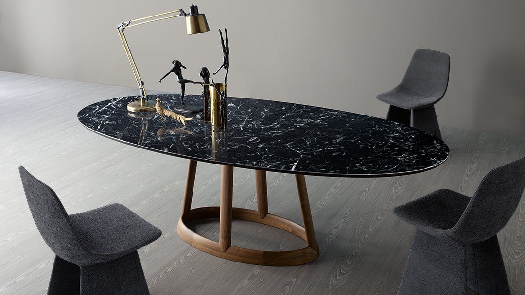 Marked by harmonious elegance, this fixed table combines a solid wooden base, available in two different finishes (American walnut and coal ash), with an oval or round top made with different finishes in marble, glass or ceramic. The elegance of the top’s lines, visible in its thinness, perfectly combines with the material value and the excellence of the cabinet work on the base: the result is a table that, even in its simplicity, expresses personality and visual lightness, displaying the most classic taste without, at the same time, giving up a more contemporary aesthetic. Greeny therefore lends itself to combinations with furniture of various styles: an elegant round dining table that can embellish and enhance any context.