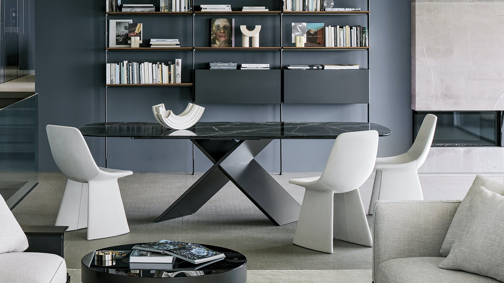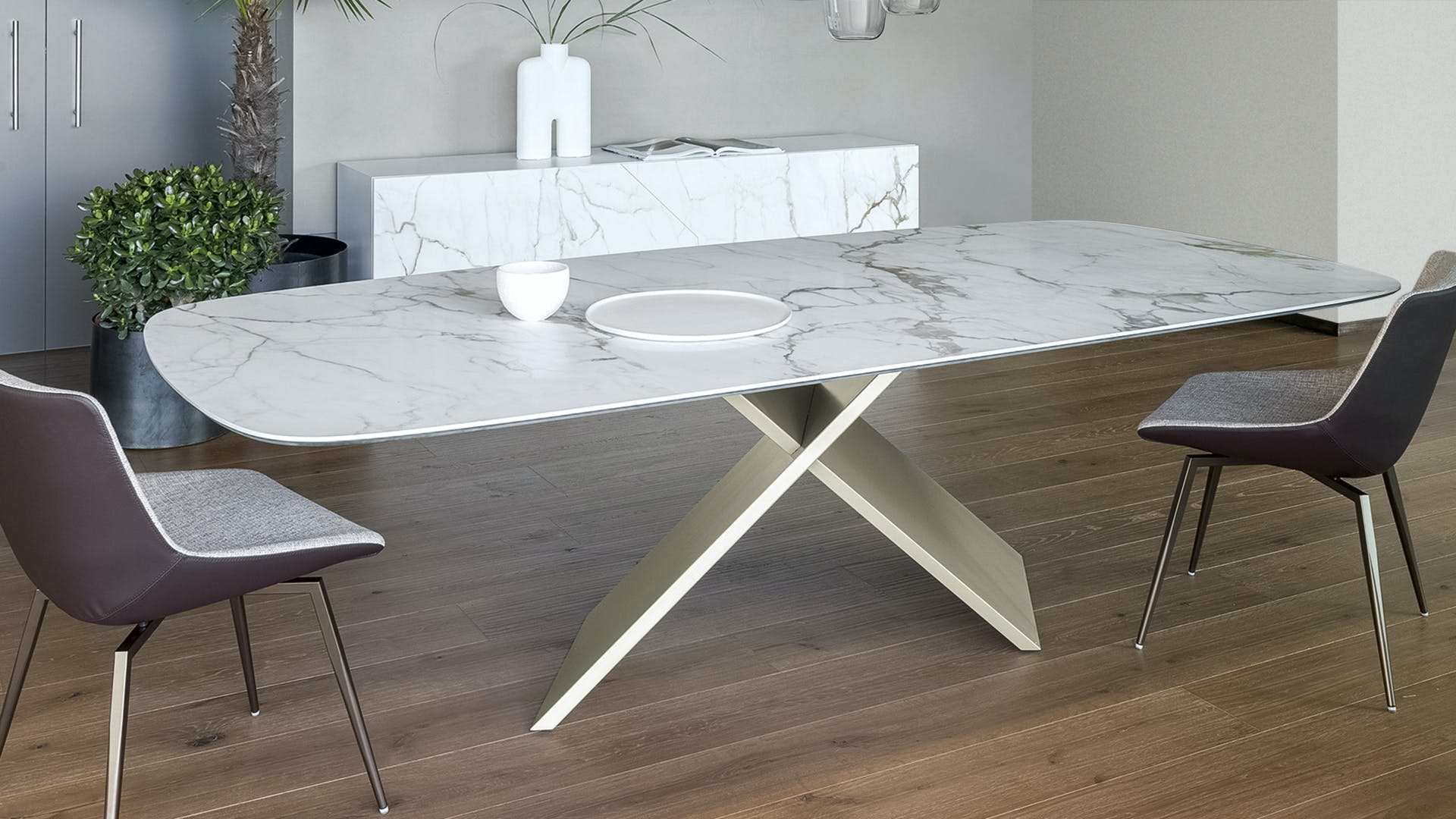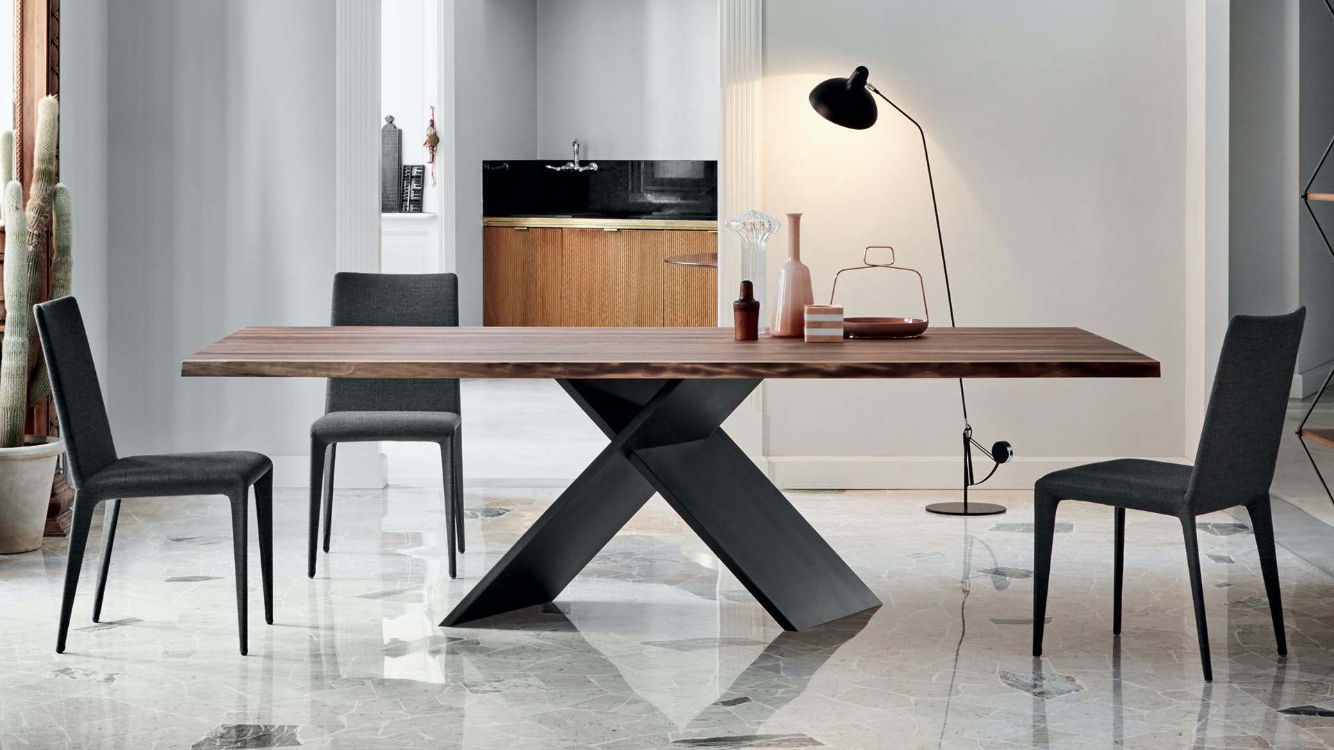 Geometric essentiality and linearity are the choices of a design language for the AX rectangular extendable dining table based on simplicity but also solidity, underlined by the sizeable base. The appeal of the material contrast between the top and the legs makes any decoration almost superfluous, enhancing the purity of the design and Bonaldo’s handcrafted excellence. The juxtaposition of very different materials underlines the contemporary feel of the design: the legs are offered in painted metal of numerous colours or burnished finish; the top, both in the fixed and extendable versions, is available in wood or ceramic. A console with the same name (AX Console) is also available for creating rooms with a coordinated style.