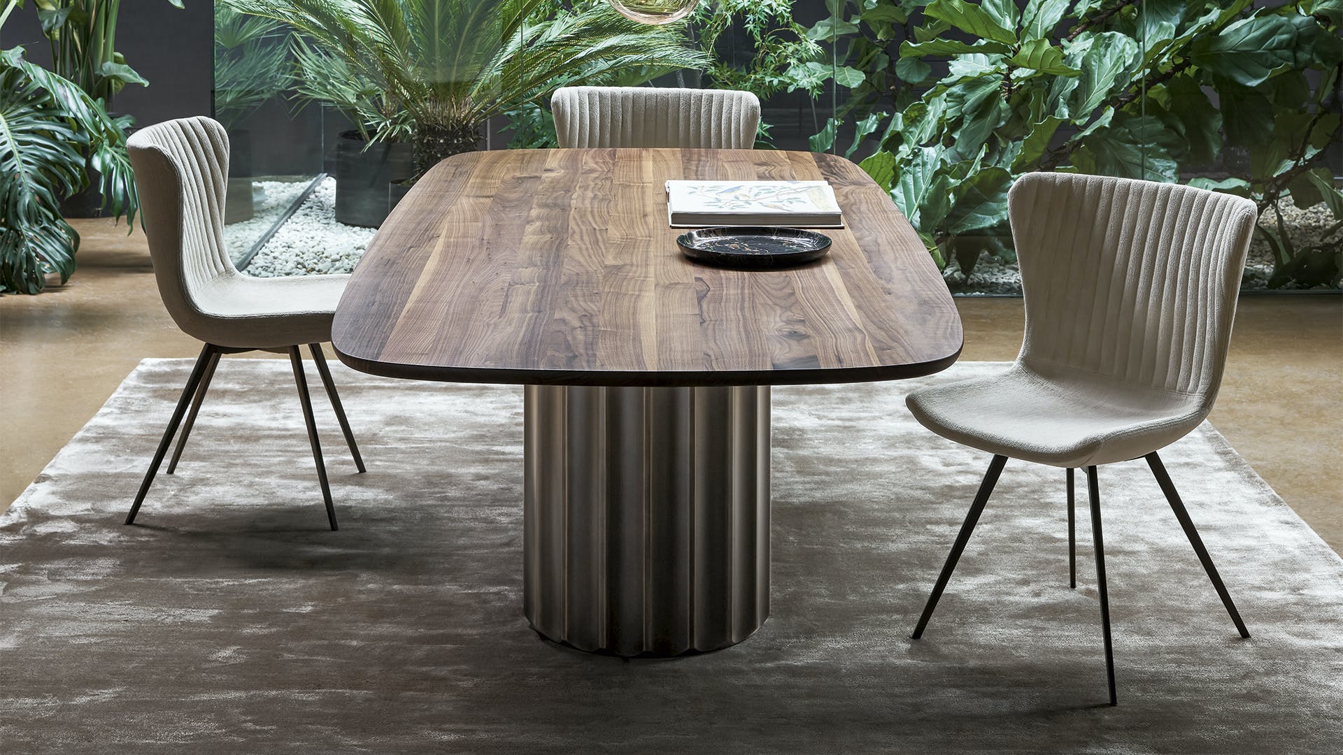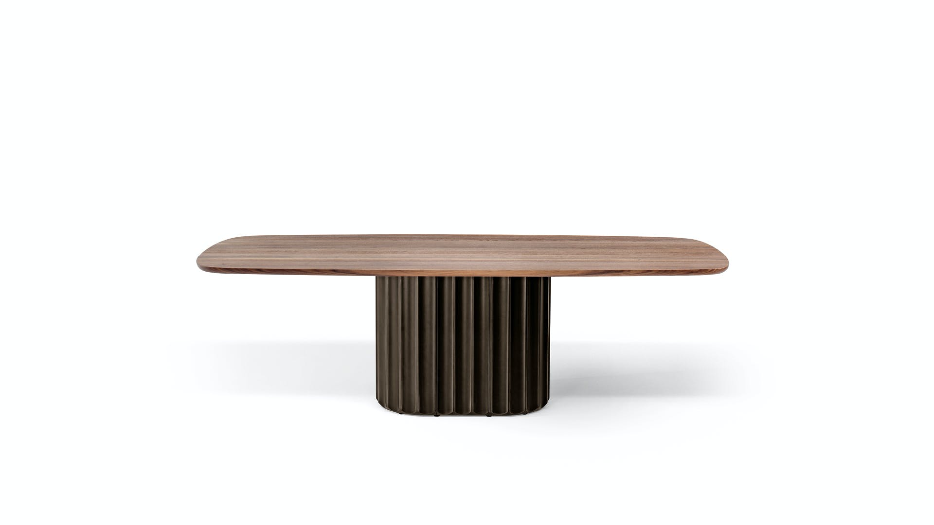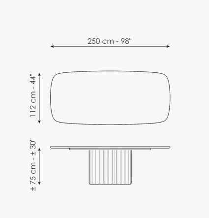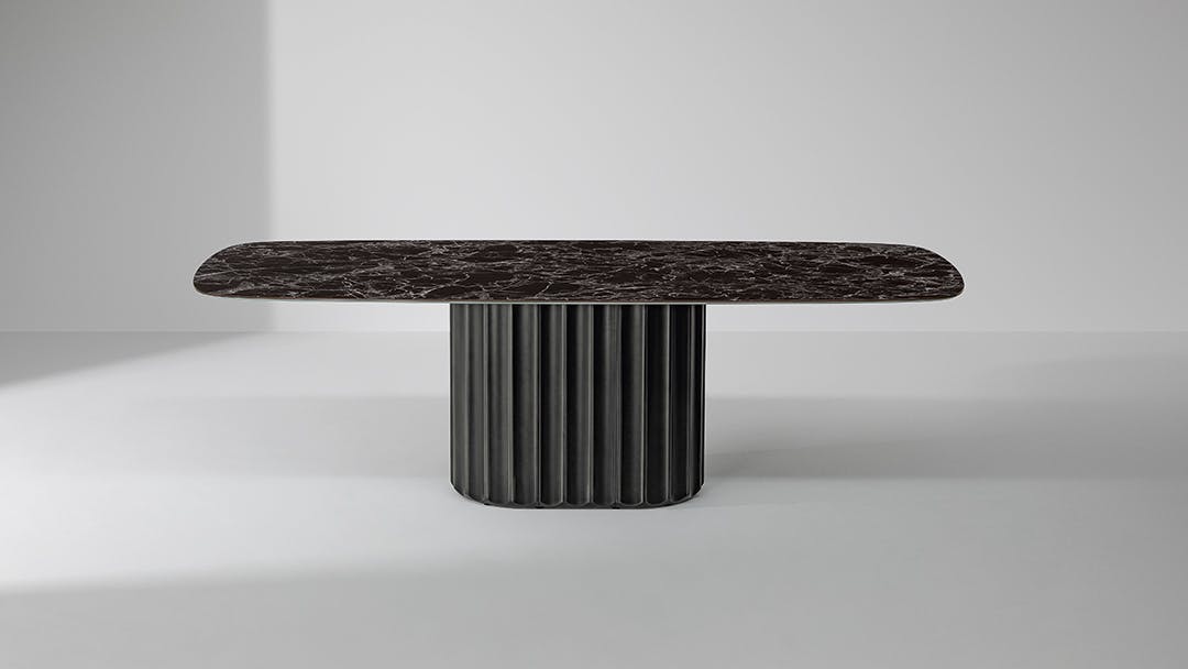 In the Dorian modern oval dining table, flexible qualities and geometric simplicity establish an interplay through contrast. The large top - made of ceramic, marble or wood - rests on a base with a striking sculptural character, consisting of an elegant and surprising elongated cylinder that recalls the shape of a Greek column and which pushes the design towards ancient architectural horizons.
