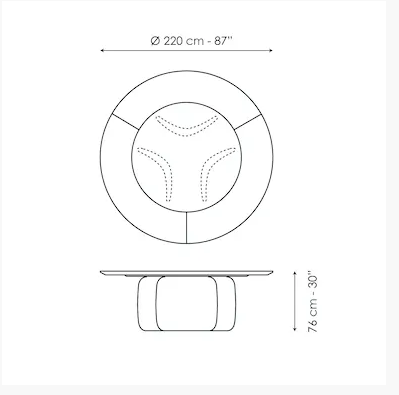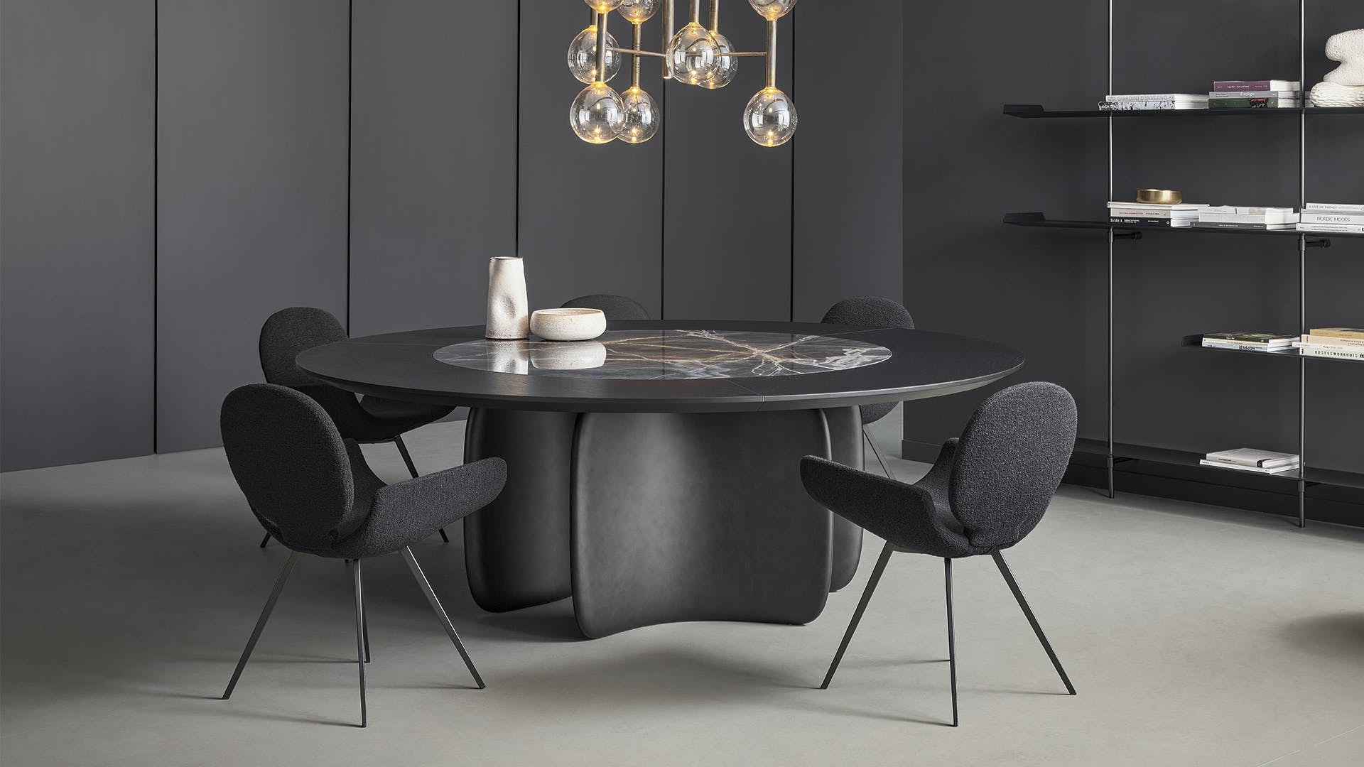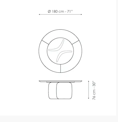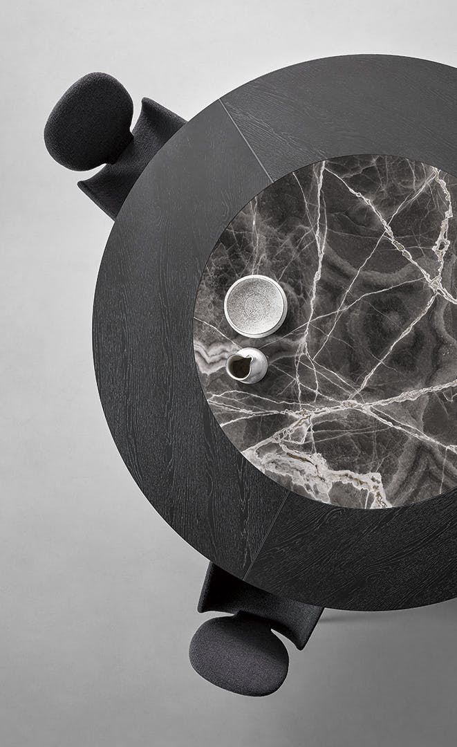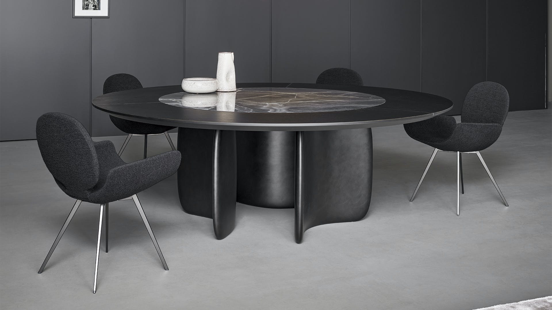 Conceived by Bartoli Design, Mellow features soft curvilinear shapes which are at the same time striking and sculptural. The base is made of curved elements moulded in high density polyurethane which in the new Mellow ST (Swivel Top) version, face outwards. The rounded shape of the base gives the structure a sinuous and balanced appearance, thus allowing the table to interact with the space in which it is inserted. The Mellow ST round design table also stands out on account of a large circular top, made using an external section in wood and a rotating internal ceramic section.