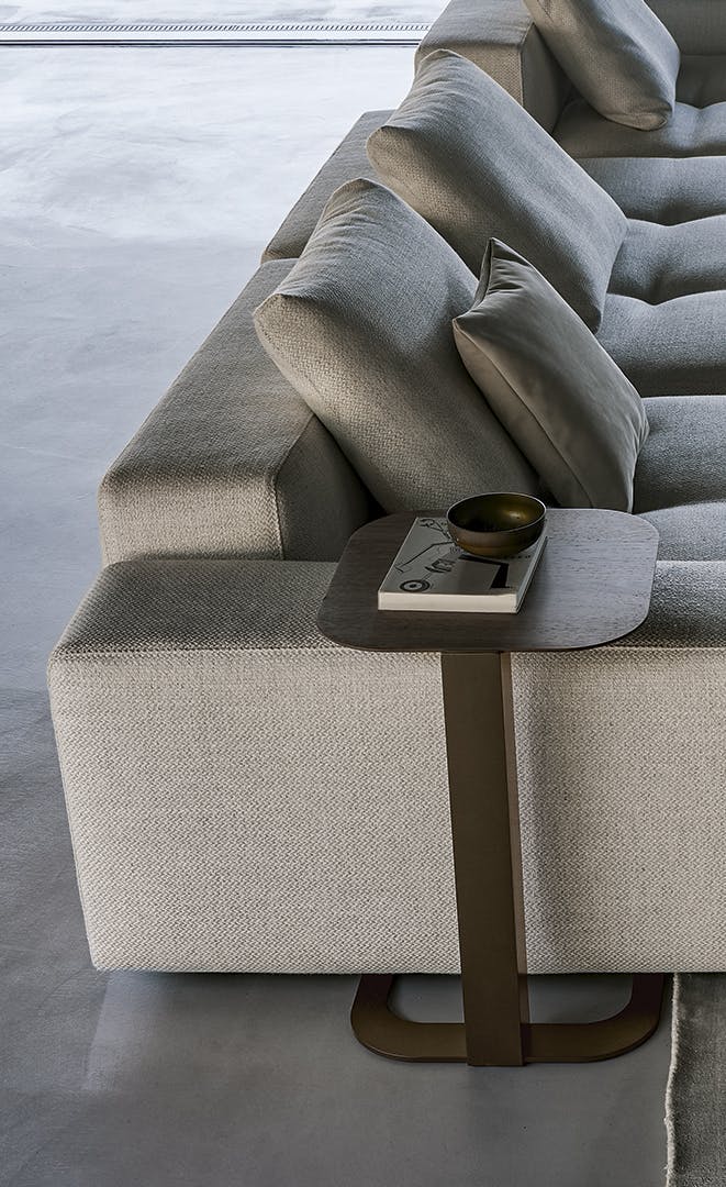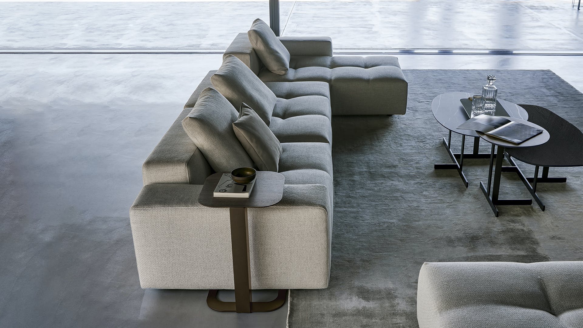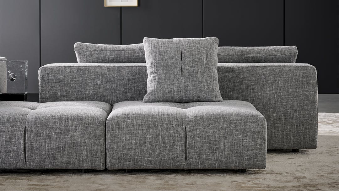 The natural union of all the elements in this collection of sofas gives rise to the harmonious atmosphere and the social appeal of the Seventies, in a language of timeless geometric purity. The Bonamour contemporary sofa is a system of seats, armrests and backrests with an essential and distinctly contemporary morphology. The modules, of various rectangular forms, can be integrated to create combinations of both linear and angular volumes. The rigorousness of the volumes, the reassuringly formal and architectural expression, is this collection’s stylistic “monogram”, whilst the sartorial attention – marked by pleats which punctuate the different geometries – is the expression of real values, achieved through high standards of handcrafted quality.