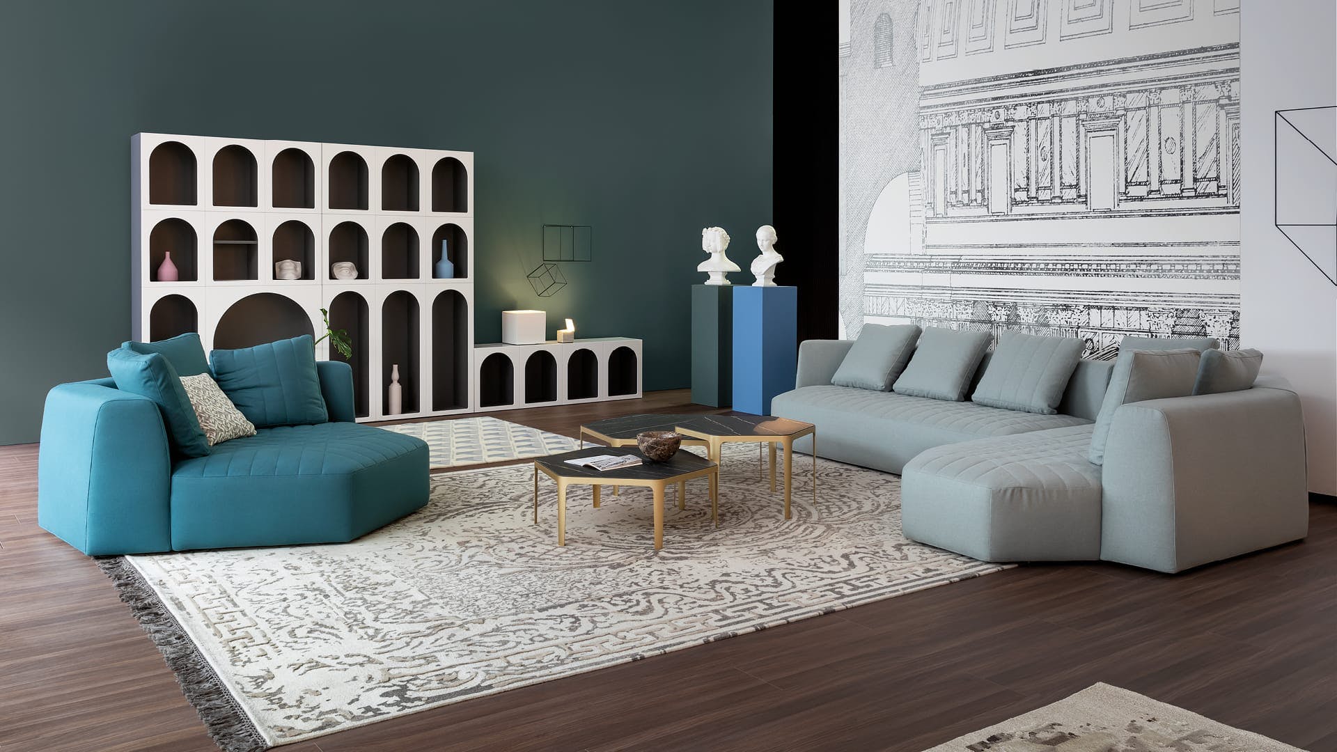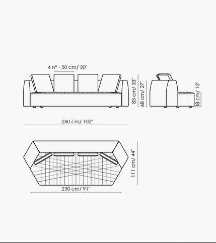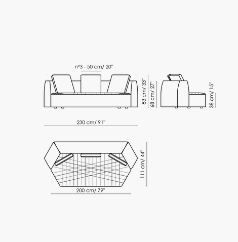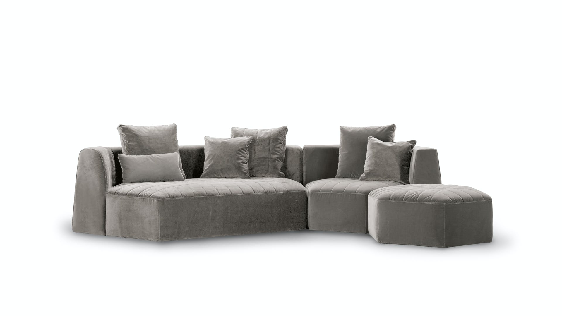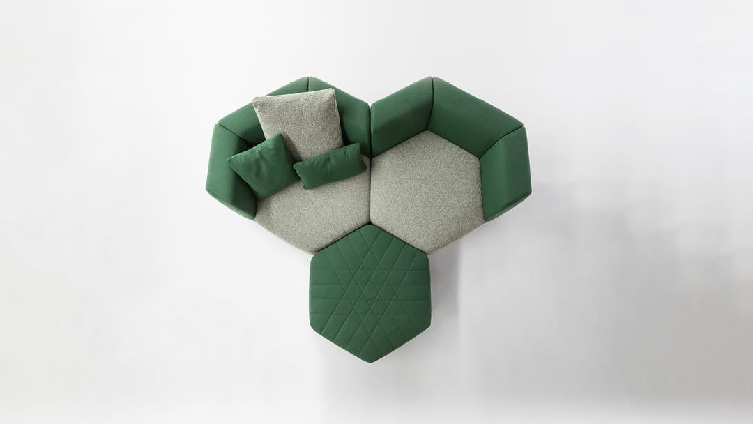 Uniting elements, bringing volumes together, creating connections: the Panorama modular design sofa is a project for the living area designed to create an absolutely new domestic landscape, to create collective spaces, islands of comfort, real protective cocoons onto which to lie back freely. Its geometry stimulates the combination of diverse elements to transform the living area into the warmest and most welcoming of environments. The Panorama collection of padded products is based on a specific item which can be considered to be the real unit of measurement of the system: the hexagonal pouf which, when fitted with armrests and a backrest, becomes an armchair which, in turn, can be combined with additional armchairs and sofas to achieve the most diverse configurations. Customisation and creativity reach their utmost expression here, and the results that can be achieved are absolutely unprecedented. The upholstery, in fabric or leather, is fully removable and is characterised by a particular quilting on the seat.