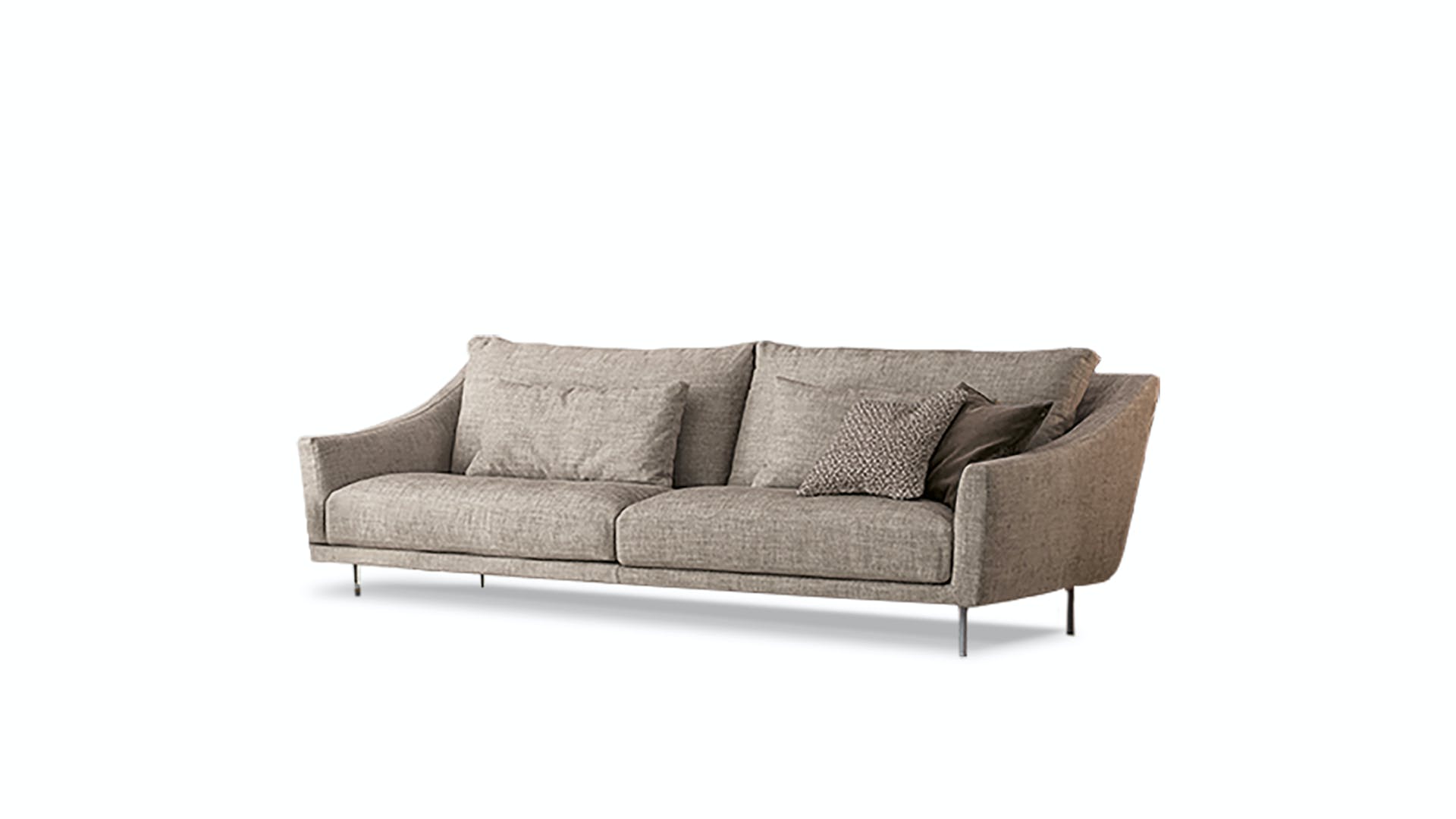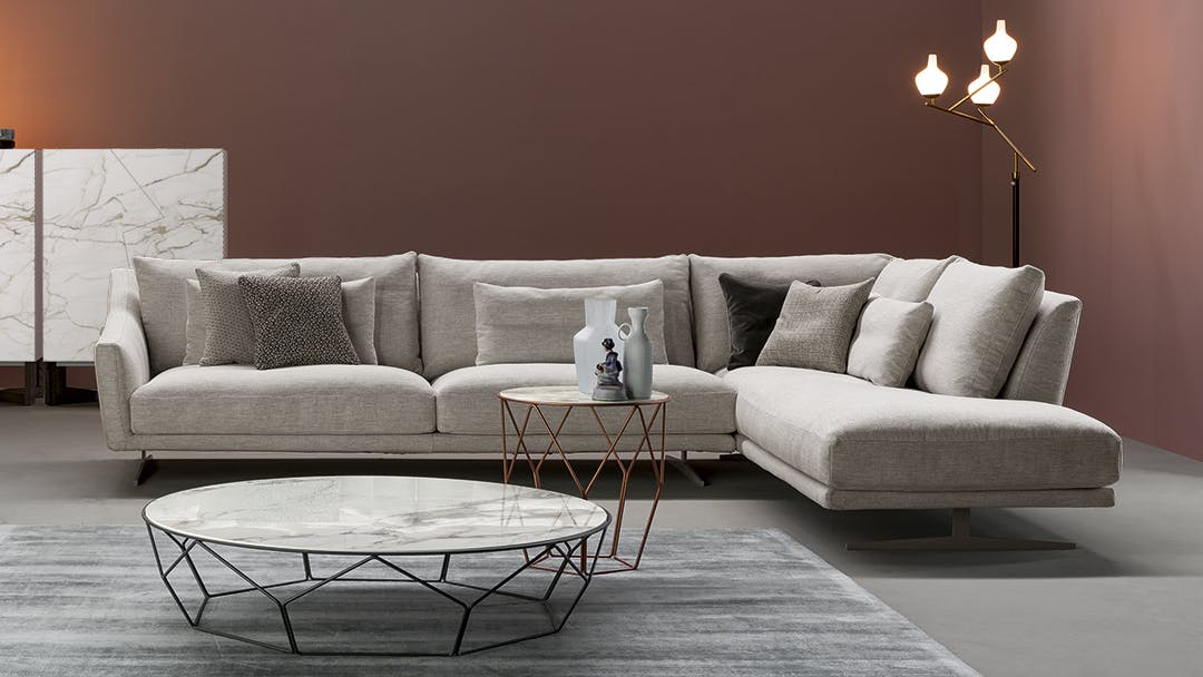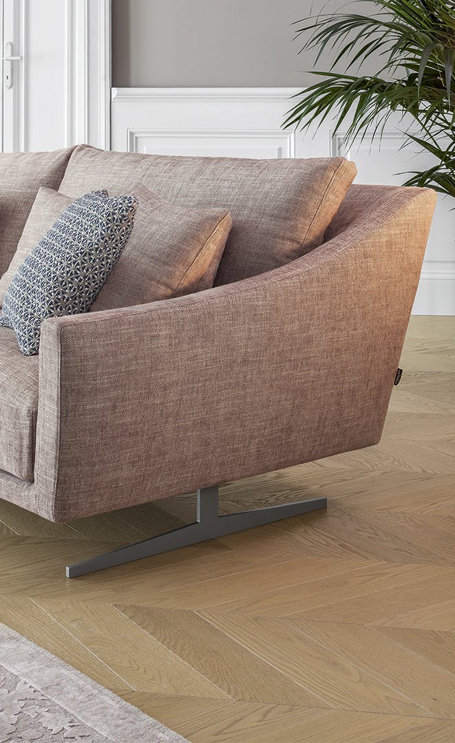 Skid is an elegant sectional sofa for living rooms characterized by soft back cushions and a delicate inclination of the armrests, a characteristic that lightens the overall appearance. The lightness is further enhanced by the particular conformation of the body, that is suspended from the floor thanks to a base in painted metal, available in two different forms: straight feet or bobsleigh-shaped base. The purity of the lines makes Skid suitable both for environments with a contemporary style and those of a more classic taste. In addition to the linear sofa, it is possible to create solutions with chaise longue or corners, combining poufs or opting for more creative compositions, meeting the widest variety of functional needs. The upholstery, in fabric or leather, is fully removable.
