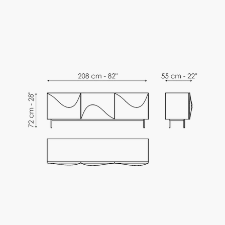 Inspired by the poster for Alfred Hitchcock’s film of the same name, the Vertigo design sideboard is distinguished by the soft wave that characterizes the front doors, creating a flow of movement on the surface that softens the rigorous design of the unit. The metal base consists of four seemingly slender feet that give the entire unit a sense of lightness. The Vertigo sideboard is available in three different colour combinations: white lacquered wood outer frame, white lacquered structural polyurethane doors, white metal base or matt bronze lacquered wood outer frame, bronze lacquered structural polyurethane doors, bronze metal base or matt lead lacquered wood outer frame, lead lacquered structural polyurethane doors, lead metal base.