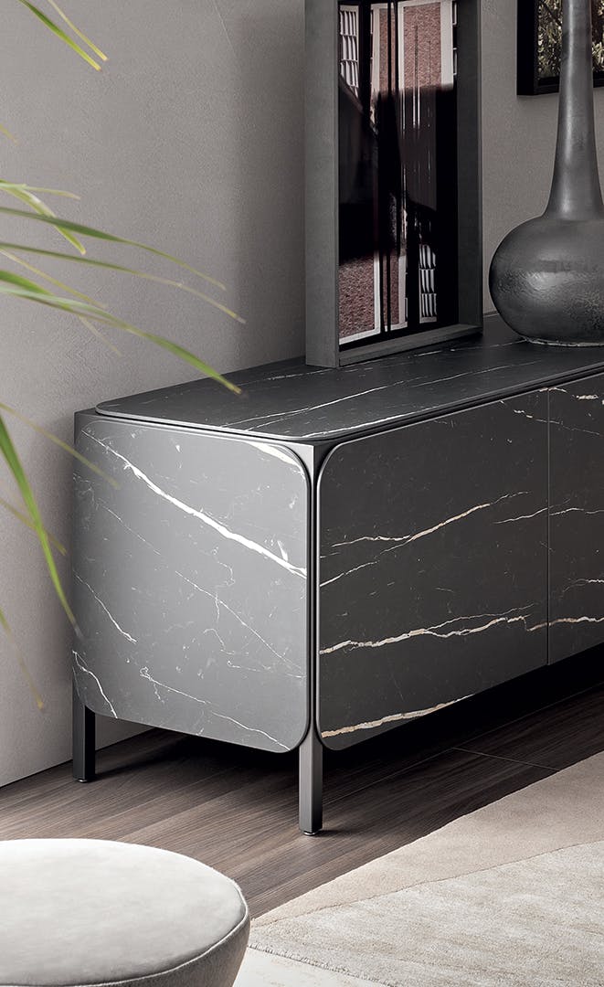 A modern sideboard with a metal frame, which gives the sideboard its name, side panels and ceramic top inserted into the frame: the Frame collection decisively represents an alternative way to design a sideboard. The sideboard stands out for its bevelled corners that give overall dynamism, making the metallic frame visible, which frames and highlights, by contrast of the ceramic doors, sides and top. The result is simple sophistication, in addition to strong personality: the multitude of personalisation possibilities allows this refined and functional furnishing element to fit into the most classic or contemporary living spaces.