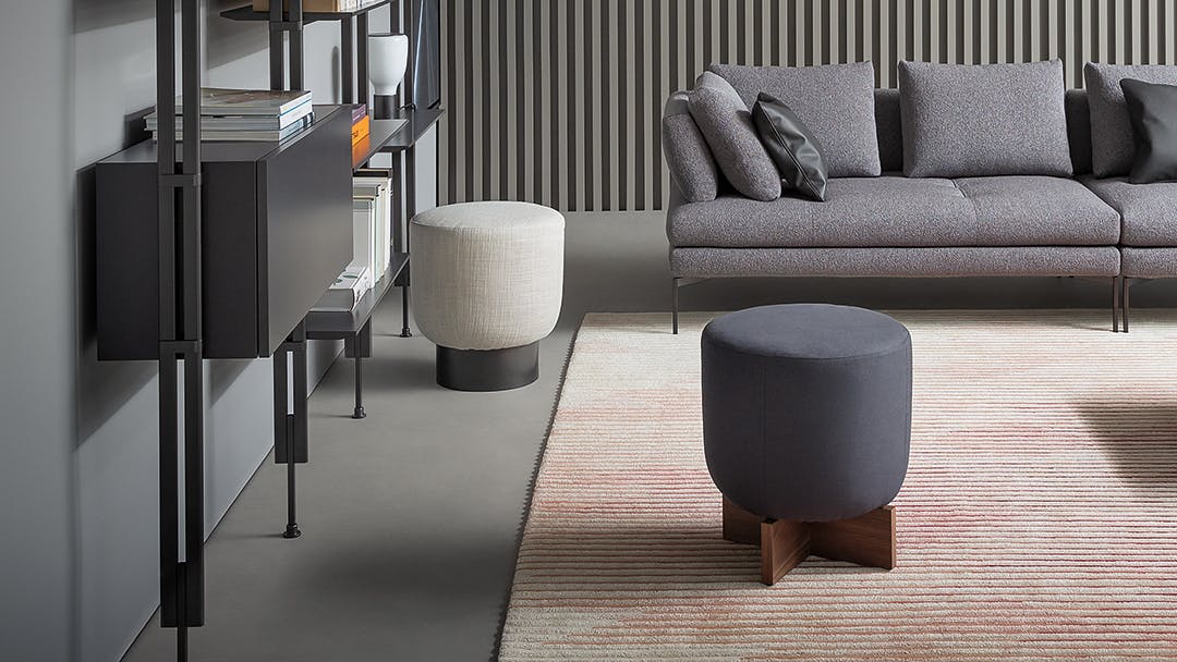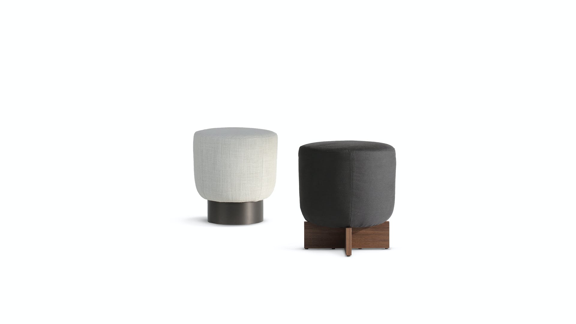 The padded top section is the same in both Belt and Cross modern footstools, with no straight lines but just curved surfaces that gently complement each other, gracefully floating on their base. They are distinguished by their bases, which give each of them a distinct personality: the Belt pouf’s round metal base plays with the concept of stability, while the Cross’s cross-shaped wooden base is the detail that makes this accessory immediately recognisable. While their similarities make them ideal for pairing together, like two members of the same family with opposing personalities that complement each other, it is their differences and the variety of possible combinations that create a dynamic, lively and constantly changing environment.