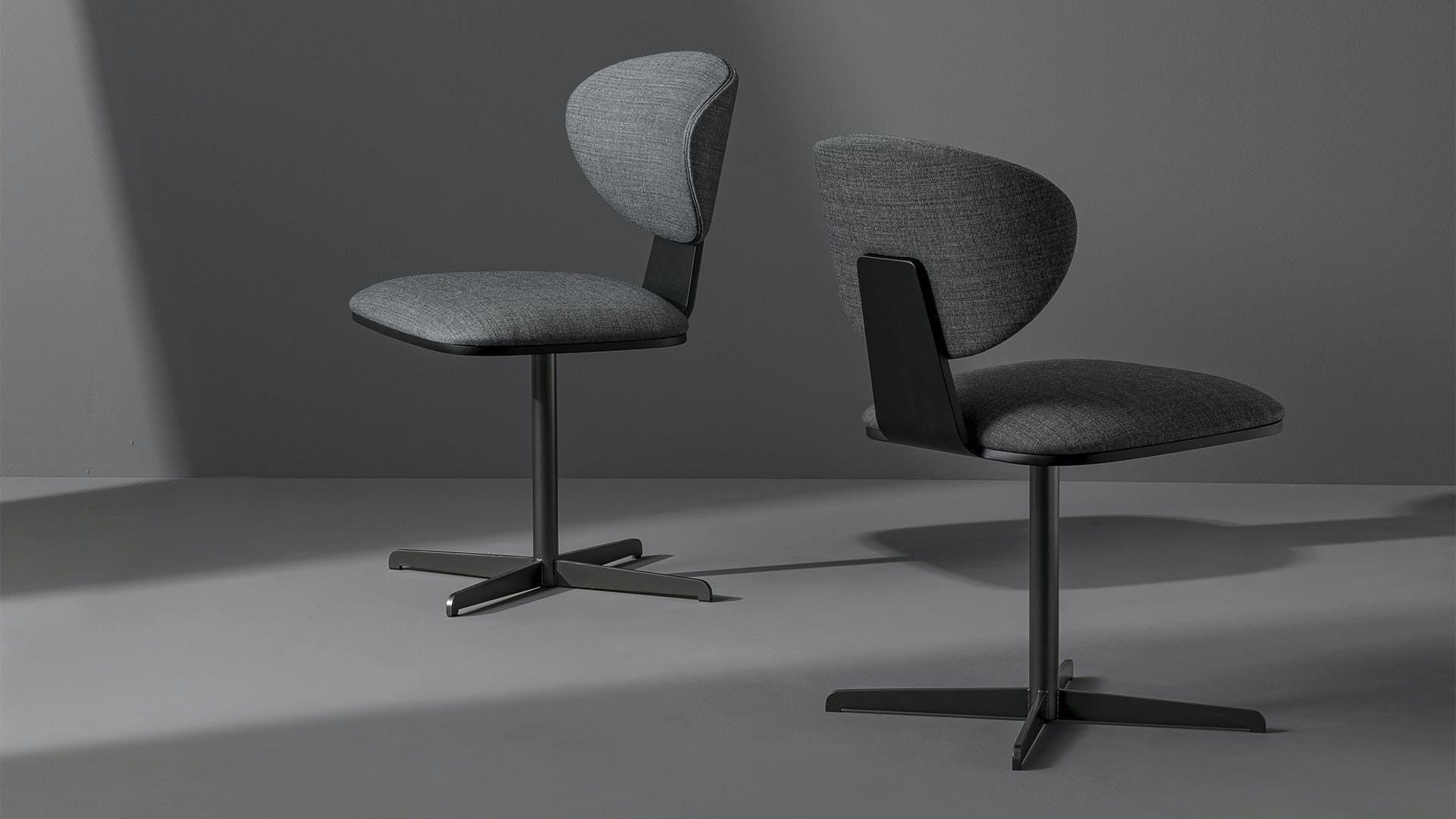 The Olos Office office chair, with a cross-shaped metal base and swivel seat, is characterized by its sinuous and essential design. The harmoniously curved laminated wood shell and ergonomically molded polyurethane seat combine comfort of form and balance of proportions. Inspired by Nordic design, Olos Office has a refined and versatile style, allowing it to be placed in home or office settings.