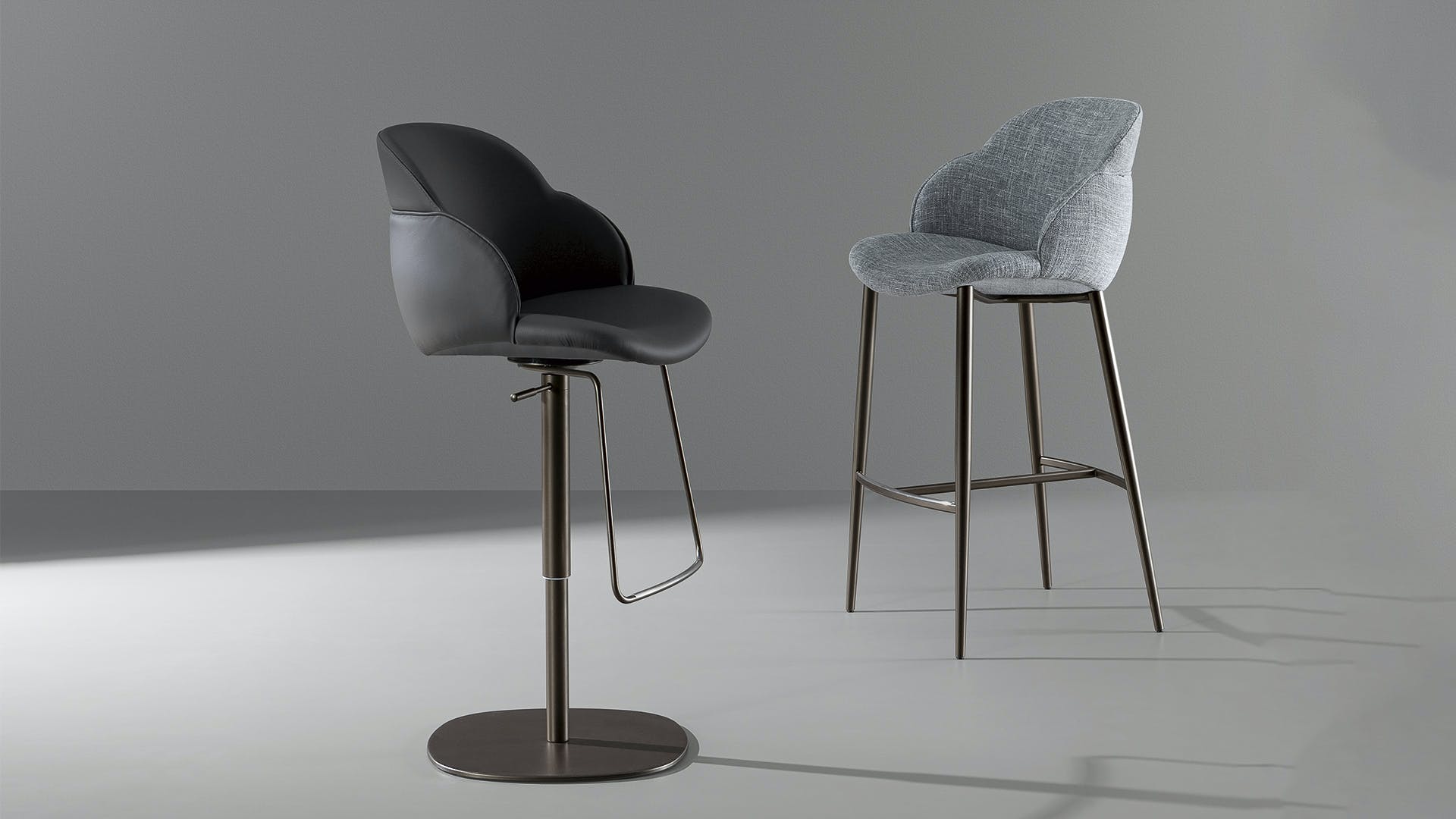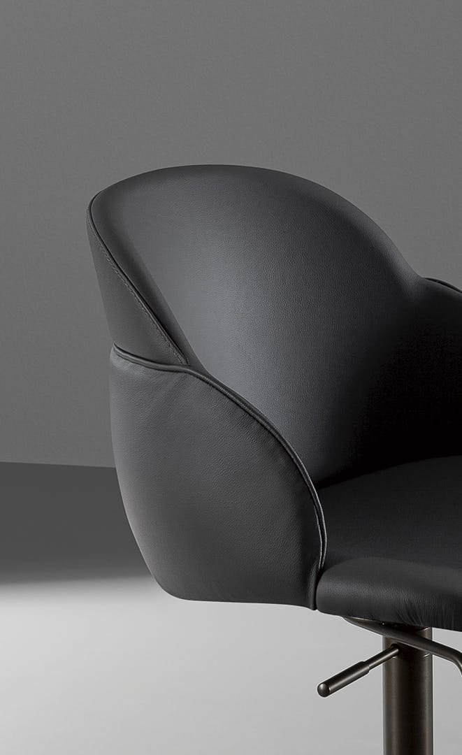 Softness and comfort are the main characteristics of the kitchen stool My way too. An element that catches the attention is the considerable padding of the body that wraps it in a precious shell. The My way too stool is available with fixed or swivel metal base while the seat and back are covered in fabric, eco-leather or leather. The variety of finishes available for the base and for the covering allows ample freedom of customization for a close dialogue with the surrounding environment.