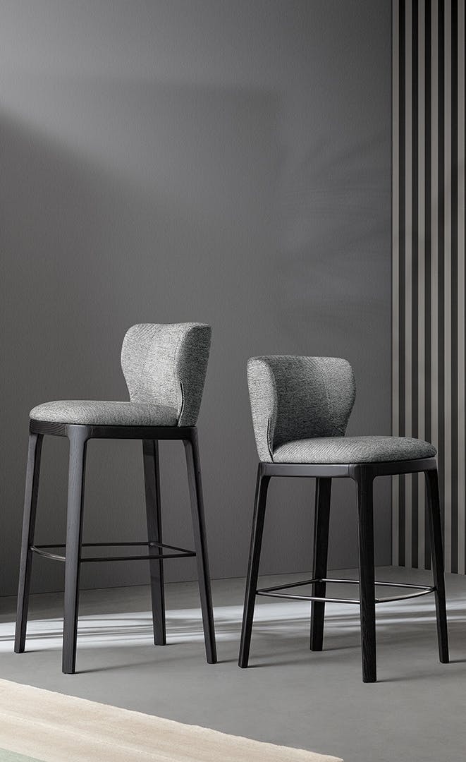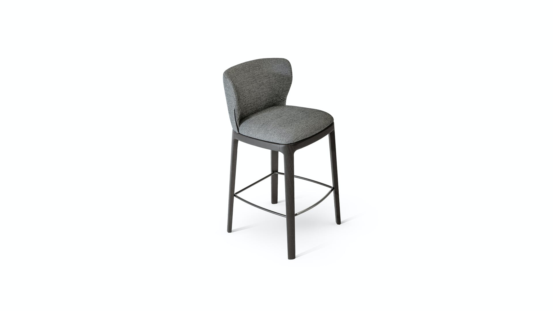 Elegant and cosy, the Joy seating collection is the result of material research that embodies traditional values in a new, contemporary way. The solid wood of the base, a distinctive element that reflects the technical durability of Joy and Miss Joy, contrasts with the soft contours of the enveloping and reassuringly shaped seat and backrest in fabric, eco-leather or leather. Joy too is the fabric stool that matches with the collection of sophisticated, comfortable chairs with a strong personality which, partly thanks to the customised finishes and colours, are perfectly suited to both residential and contract settings.
