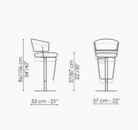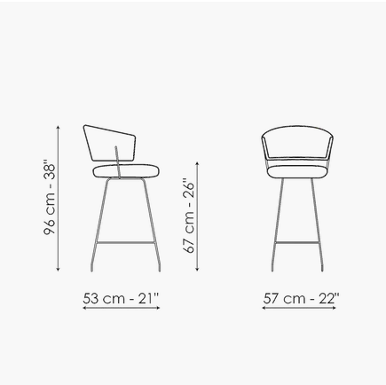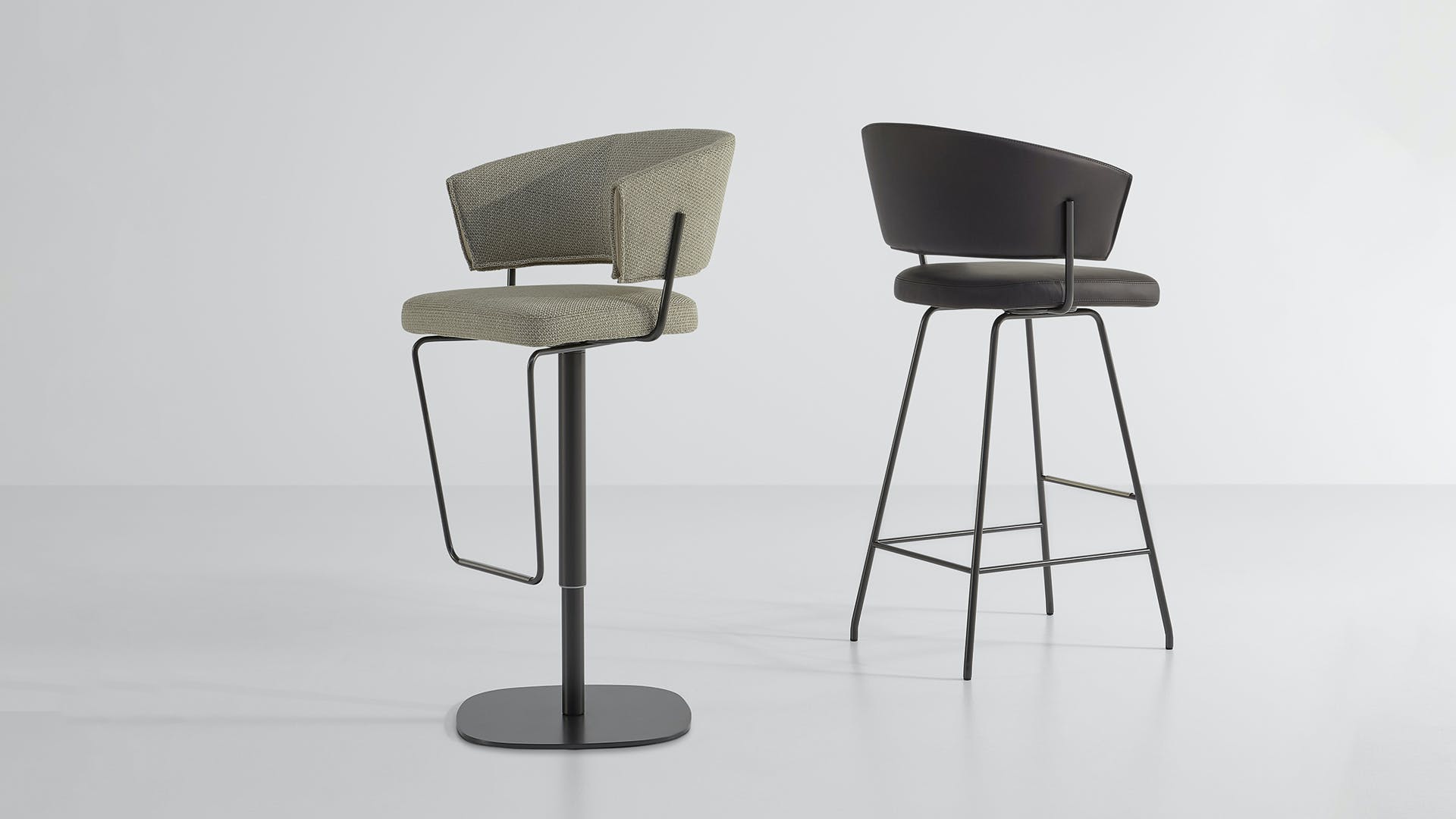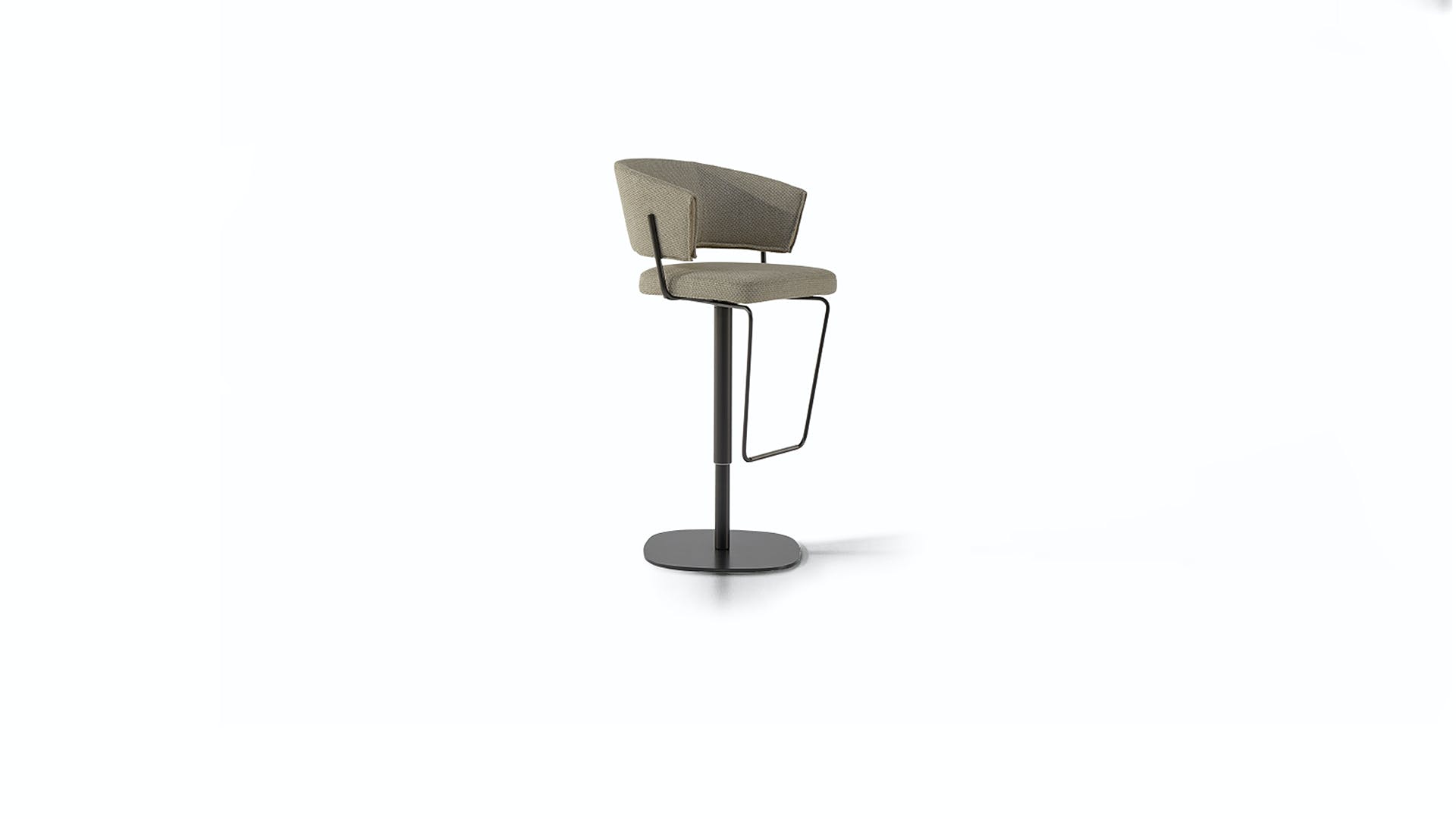 The Bahia too stool with backrest is the result of the combination of curved shapes and simple tubular metal elements, giving as a result an extremely balanced aesthetic. Available with swivel or fixed base, Bahia too is the ideal stool for furnishing both residential and contract spaces. The curved backrest allows free support of the arms and generously wraps the back. Bahia too is covered in fabric, eco-leather or leather.