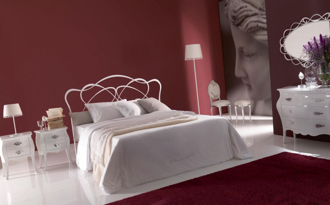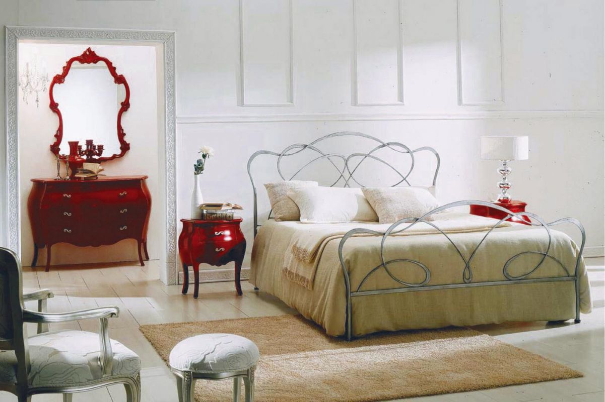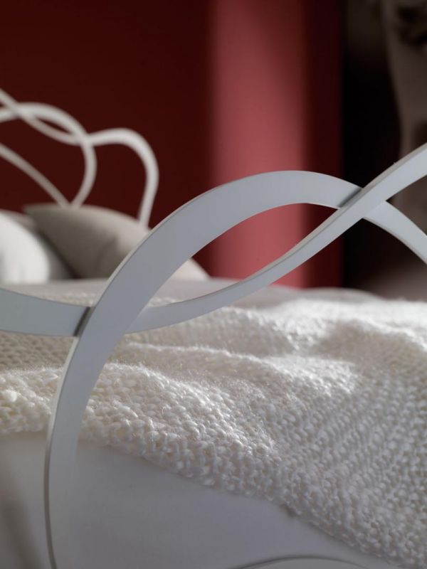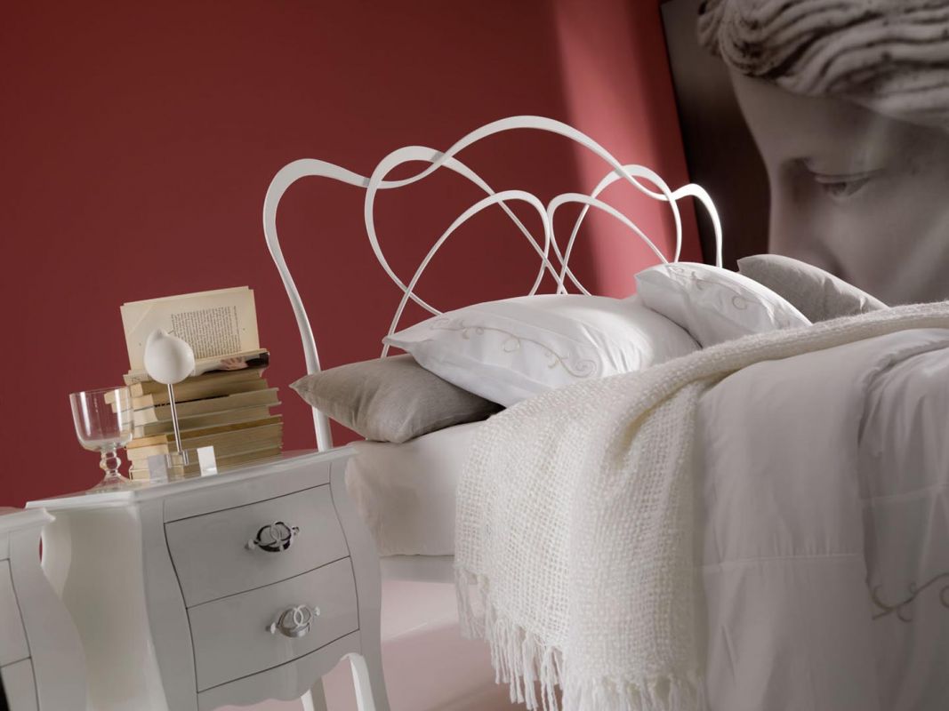 Iron bed in lacquered or hand-coated metal frame, in double version, with footboard, bed ring or storage unit.