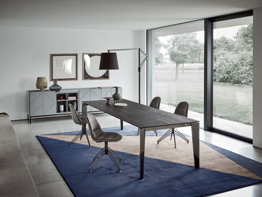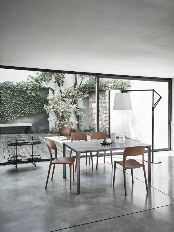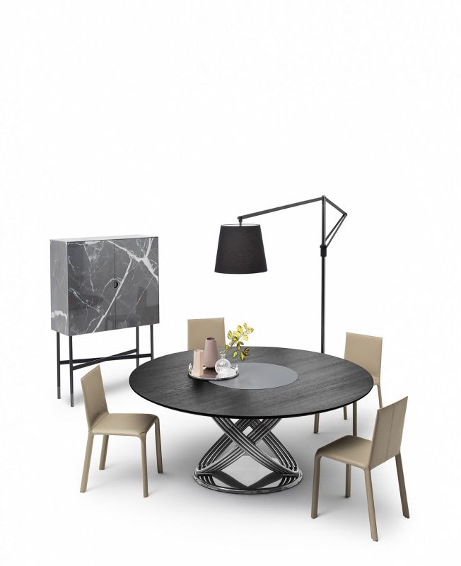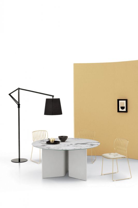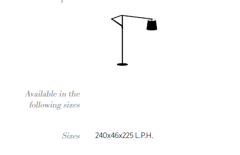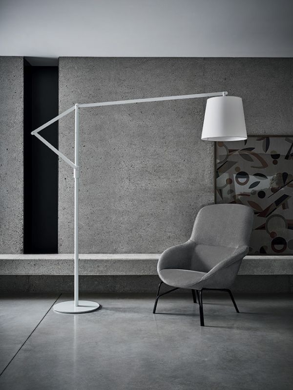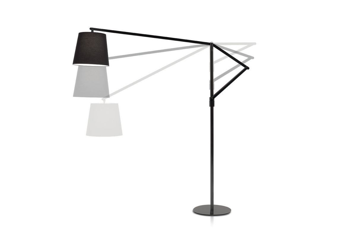 Floor lamp with with frame and base in lacquered metal and adjustable arm in lacquered aluminium. Lampshade in fabric.