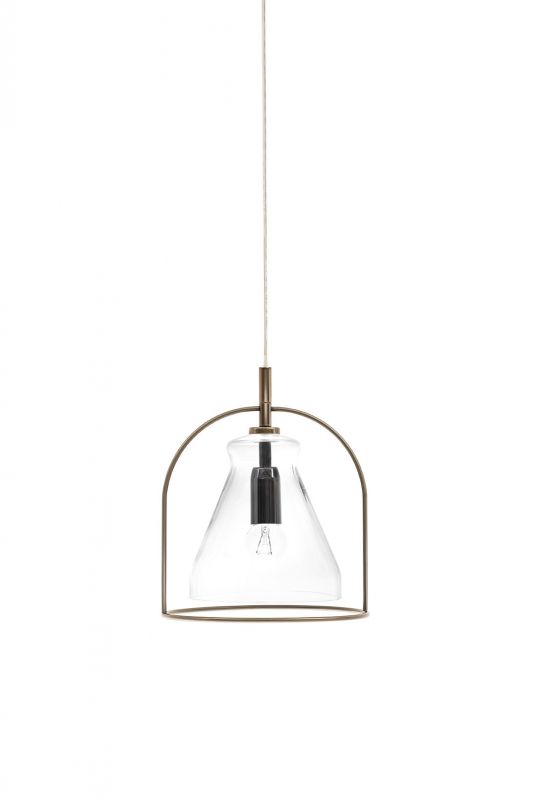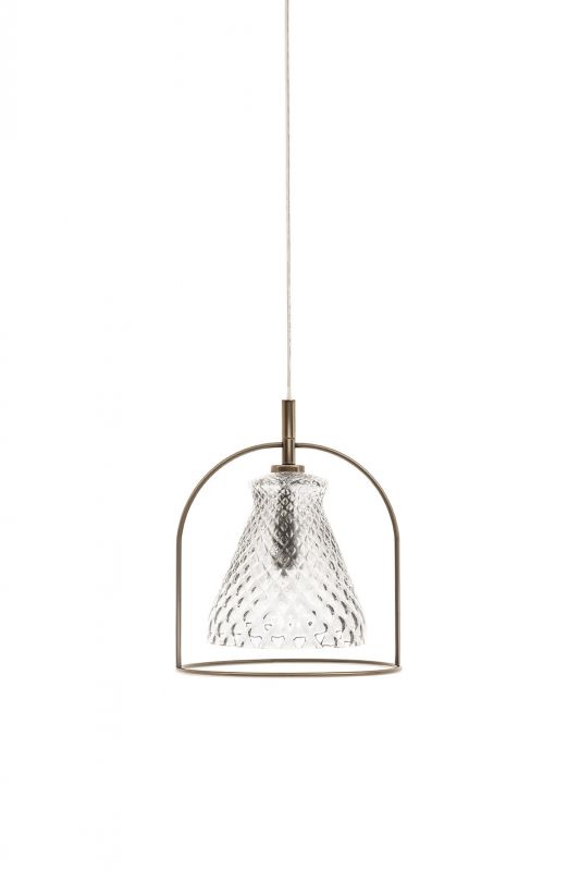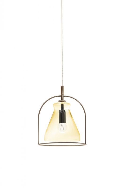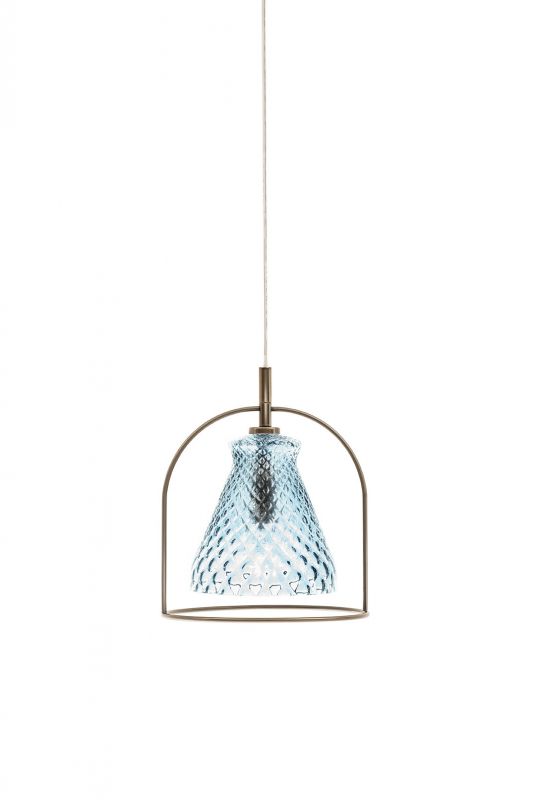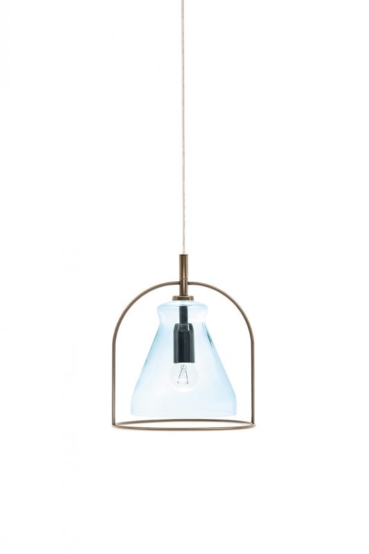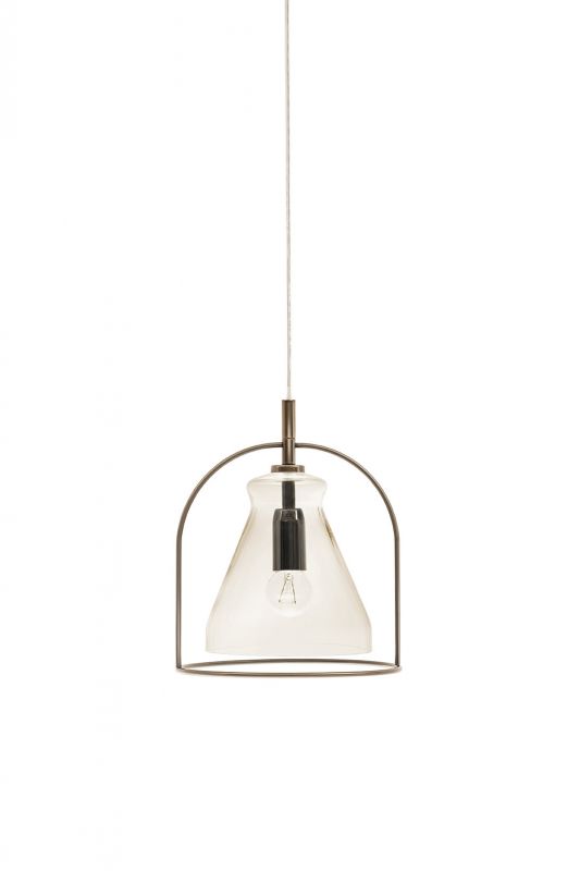 Ceiling light with chromed celiling rose and transparent cable. Laquered metal frame. Hand floating glass.