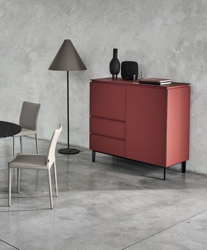 Wooden storage unit available with doors, drawers, baskets or open spaces. Groove opening system. Inside shelves in clear Glass. Top, frontal and side panels in glossy Glass and velvet matt Anti-scratch Glass.