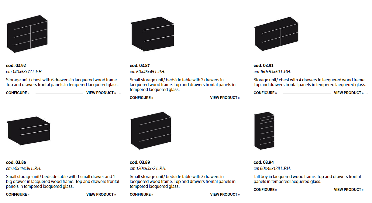 Storage collection, storage unit and tall boy in matt lacquered wood, top and drawer's frontal panels in glossy lacquered glass.