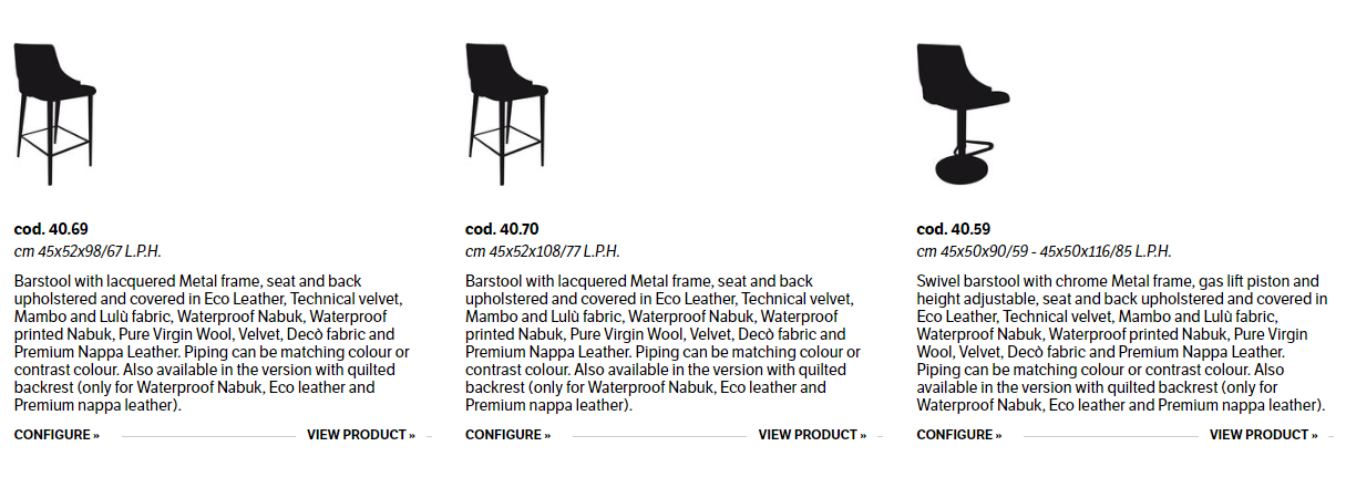 Barstool with lacquered Metal frame, seat and back upholstered and covered. Piping can be matching colour or contrast colour. Also available in the version with quilted backrest (only for Waterproof Nabuk, Eco leather and Premium nappa leather).