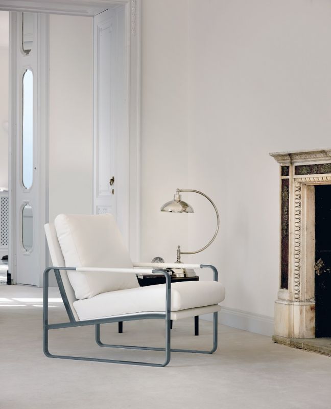 Armchair with lacquered Metal frame, seat and back upholstered and covered in Eco Leather, Technical velvet, Mambo and Lulù fabric, Waterproof Nabuk, Waterproof printed Nabuk, Velvet, Decò fabric and Premium Nappa Leather.